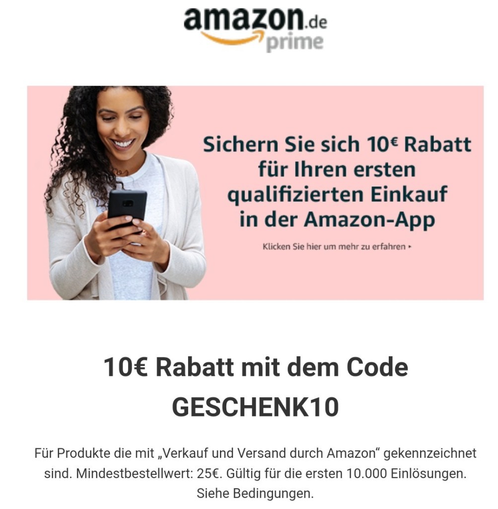Amazon.de: 10 Euro Rabatt beim ersten Einkauf über die App (MBW: 25 Euro)