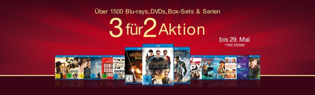 „Sichern Sie sich jetzt und nur bis zum 29.Mai 3 Blu-rays und DVDs zum Preis von 2 aus einer Auswahl von über 1500 Blu-rays, DVDs, Box-Sets und Serien.“