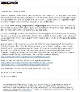 Amazon hat heute per Email zu einer Umfrage eingeladen. Am Ende bekommt man dafür einen 3€ Gutschein, der bis zum 30.12.15 zugesendet wird. Die Gültigkeit des Gutscheins ist bis zum 31.03.2017.