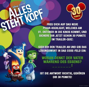 Bei Disney & More gibt es aktuell wieder ein Trailerquiz zu dem Film “Alles steht Kopf“, als Belohnung gibt es 30 Punkte.