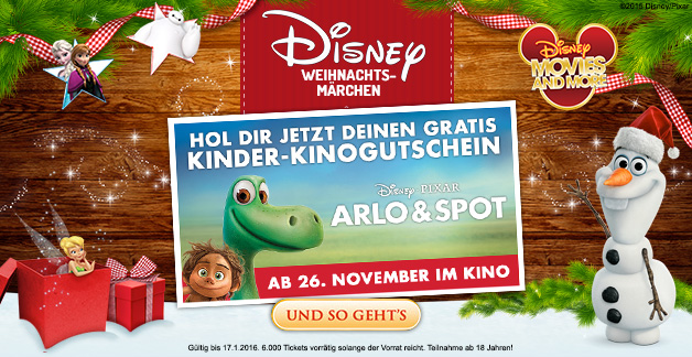 Disney Movies & More: Disney Weihnachtsmärchen 2015 – Kinder Kinogutschein für Arlo + Spot geschenkt