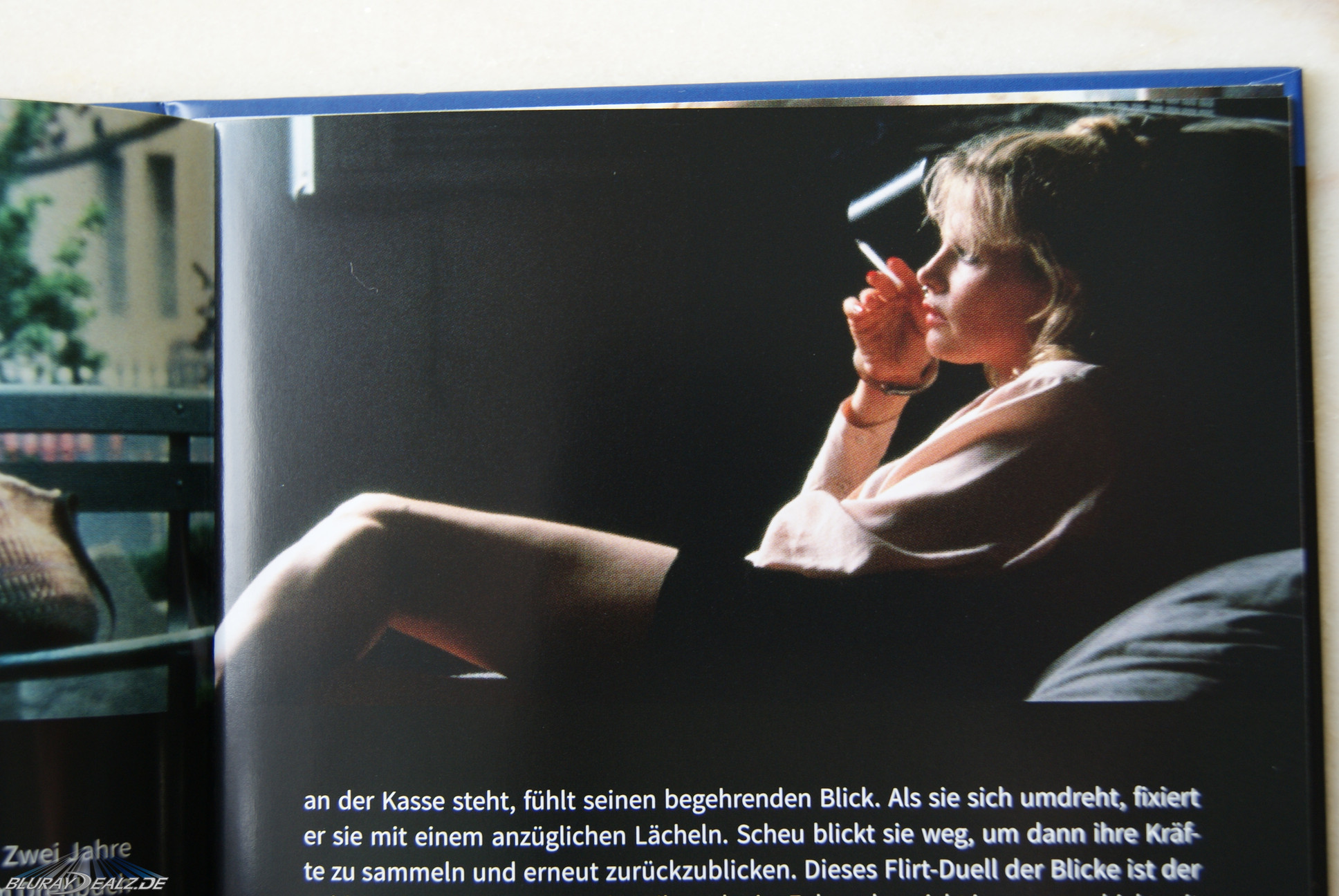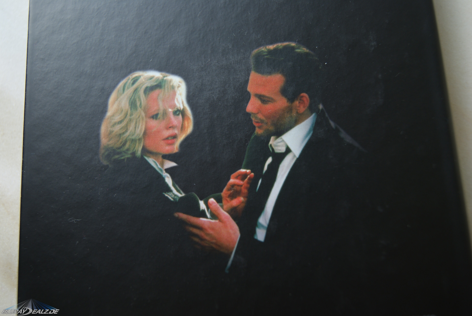 Auf der Vorderseite sehen wir Kim Basinger in recht, nun ääh, ansprechender Pose. Das Cover kennt man von einigen ausländischen Blu-ray-Releases. In Deutschland erscheint dieser Film übrigens nun erstmals als Blu-ray. Auch die Rückseite ziert ein Motiv mit den beiden Hauptdarstellern. Größer noch als bei der Oliver Stone Collection, aber auch nicht formatfüllend. Das Mediabook ist übrigens wieder recht dick (2 cm), was zuvorderst aber an dem dicken Tray liegt. Innen befindet sich die Disc links, das Booklet ist rechts angebracht. Darüber liegt wieder der bekannte Werbeflyer und das Filmposter (wieder im Format von ca. 38×48 cm). Entfernt man die Disc (wieder im einheitlichen „Essentials“- Look) sieht man einen schönen großformatigen Druck (Größe wie der Innenprint eines Steelbooks), der sich vom Tray bis zur ersten Seite des Booklets zieht. Sieht sehr gut aus. Das Booklet selber geht über 20 Seiten, wobei die letzte wegfällt, da sie mit dem Mediabook verklebt ist. Im Booklet finden sich zum einen sehr viele – teils großformatige – Bilder, zwei Porträts über Mickey Rourke und Kim Basinger sowie wieder ein Essay von Prof. Dr. Marcus Stiglegger (Slaves to love – Wie 9 1/2 Wochen den Sadomasochismus in den Mainstream trug).