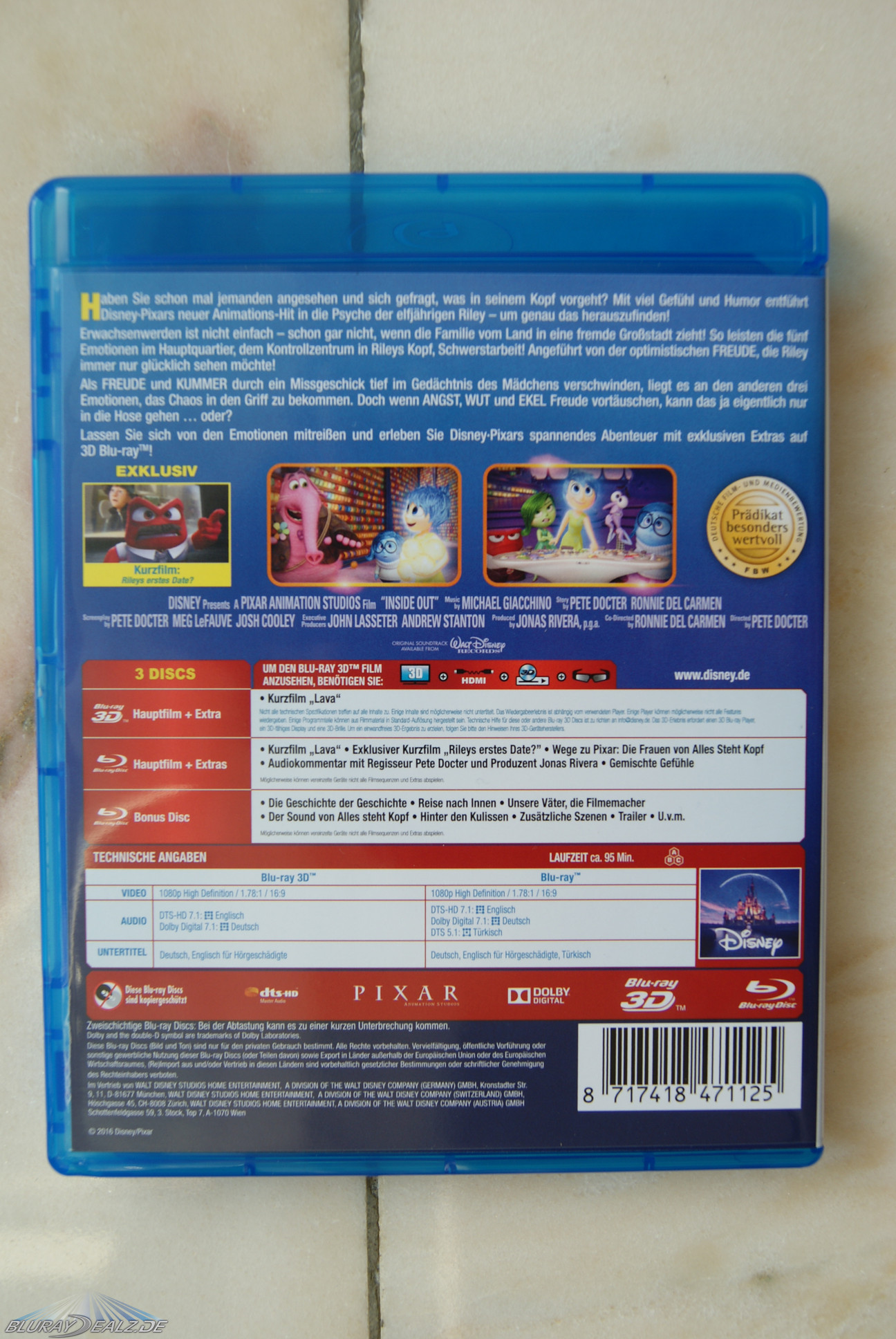 Die Rückseite birgt ein Filmzitat und einige Worte zu dieser Emotion. Der Clou: Durch eine Aussparung auf der Vorderseite des Schubers kann man das Cover durch Austauschen der Emotionskarten immer wieder ändern. Sehr nett! Ein weiterer Vorteil gegenüber der normalen Schuber bei Disney 3D-Filmen ist der Umstand, dass der FSK-Flatschen nur ein Aufkleber ist und diesmal also problemlos entfernt werden kann. Schade ist jedoch, dass diesmal keinerlei Glanzeffekte oder Prägungen auf dem Schuber sind – da gab es schon deutlich bessere Veröffentlichungen diesbzgl. Die Amaray hat Disneytypisch wieder kein Wendecover. Auf der 2D-Blu-ray befindet sich übrigens der exklusive Kurzfilm „Rileys erstes Date“, also eine kurze Fortsetzung zum Film.
