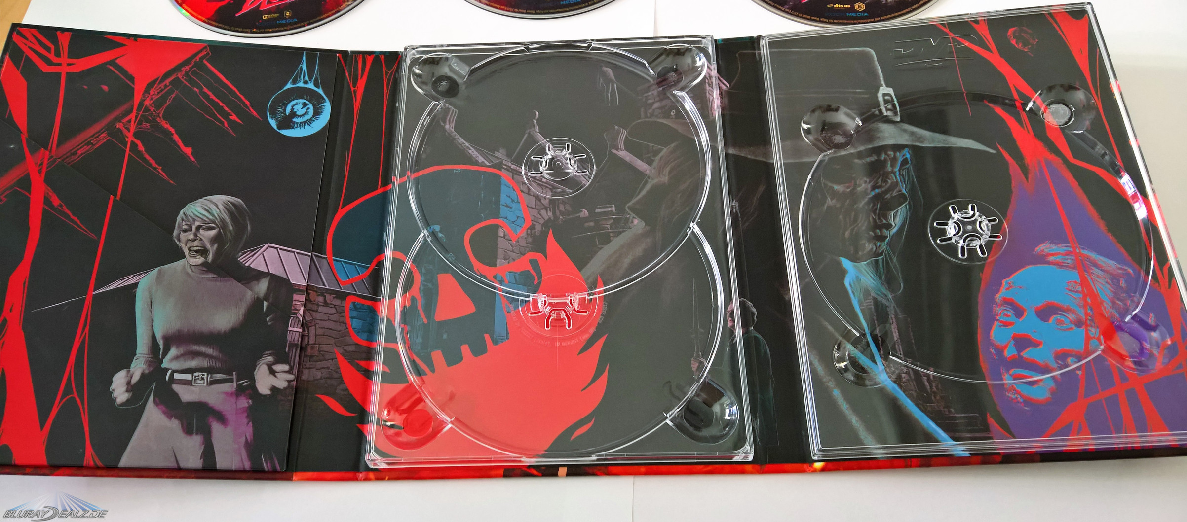 Nachdem man die Folie entfernt hat, hat man einen Brocken von Buch in der Hand. Der FSK Aukleber flutscht runter und man hat den liebevoll ausgeschnippelten Schuber im Blick. Dieser wunderschön gestaltete Schuber ist vorne so ausgeschnitten, dass man einen Viertelblick auf das darunter befindliche Digibuch hat. Der Spine hat den Bava Collectors Edition Hinweis, den Filmtitel und diesmal wieder ein Logo oder so, in Form eines Totenkopfes mit brennendem Auge darunter. Die super gestaltete Rückseite zeigt uns alle Extras, den Filminhalt, Szenenfotos und Informationen zu den Formaten.