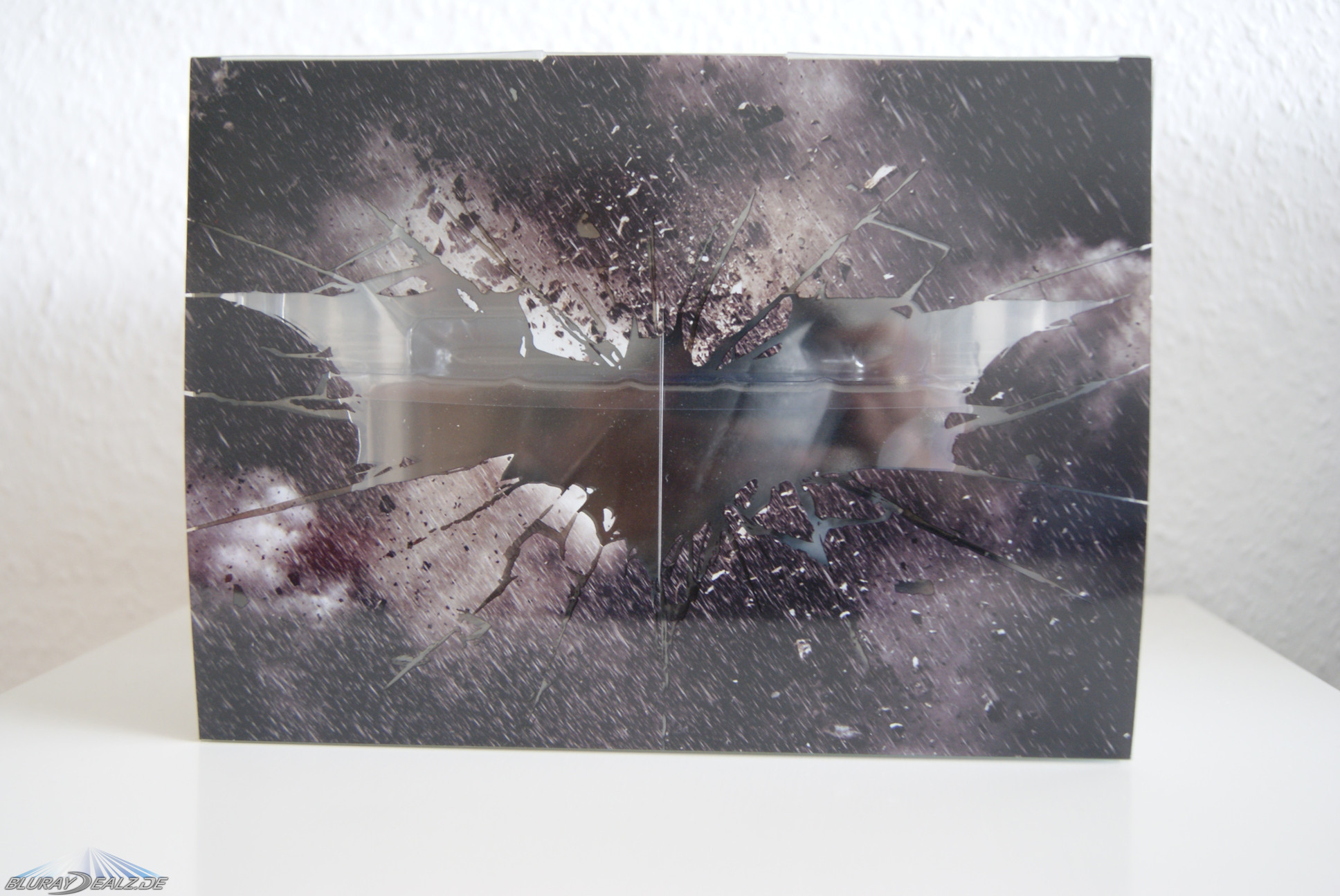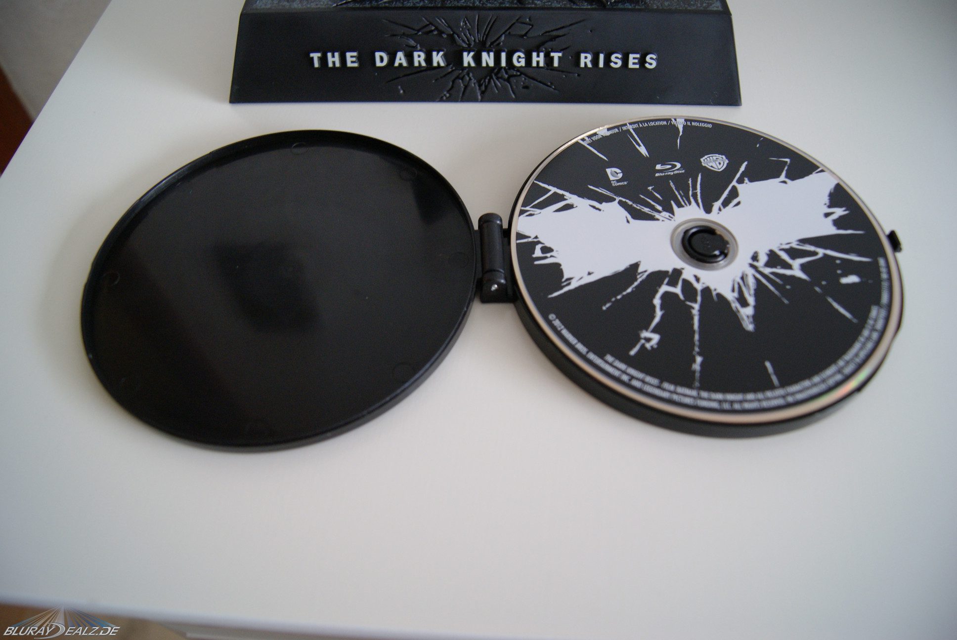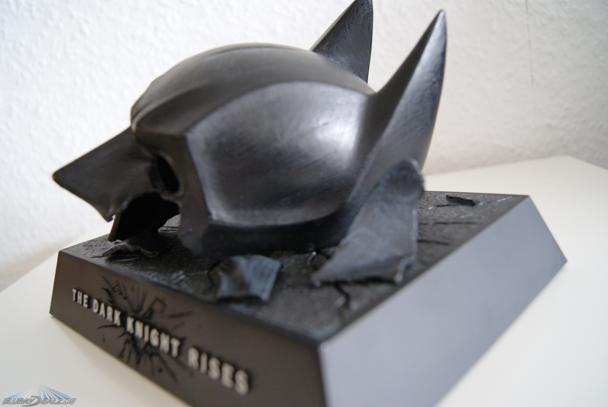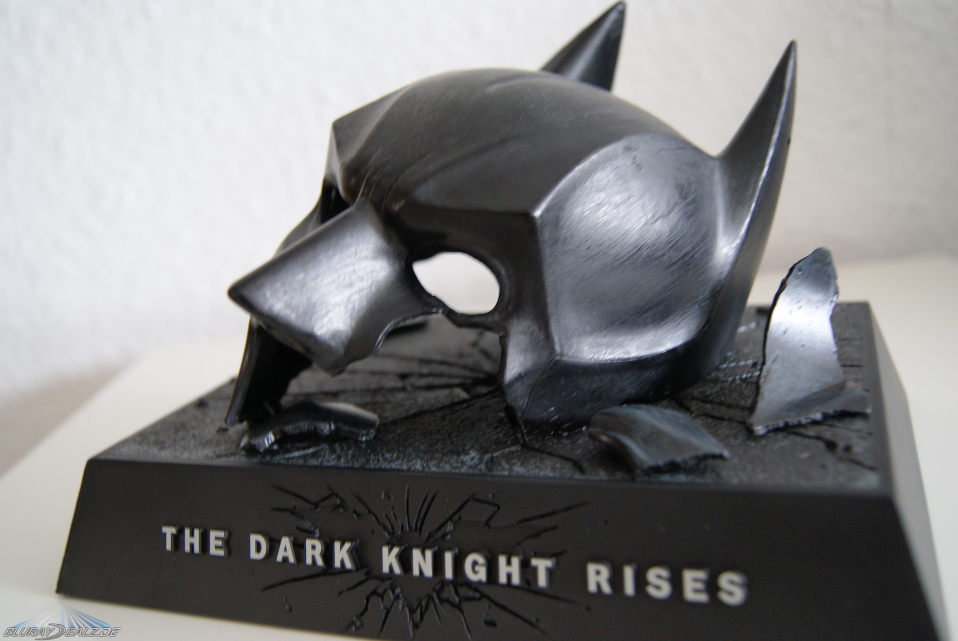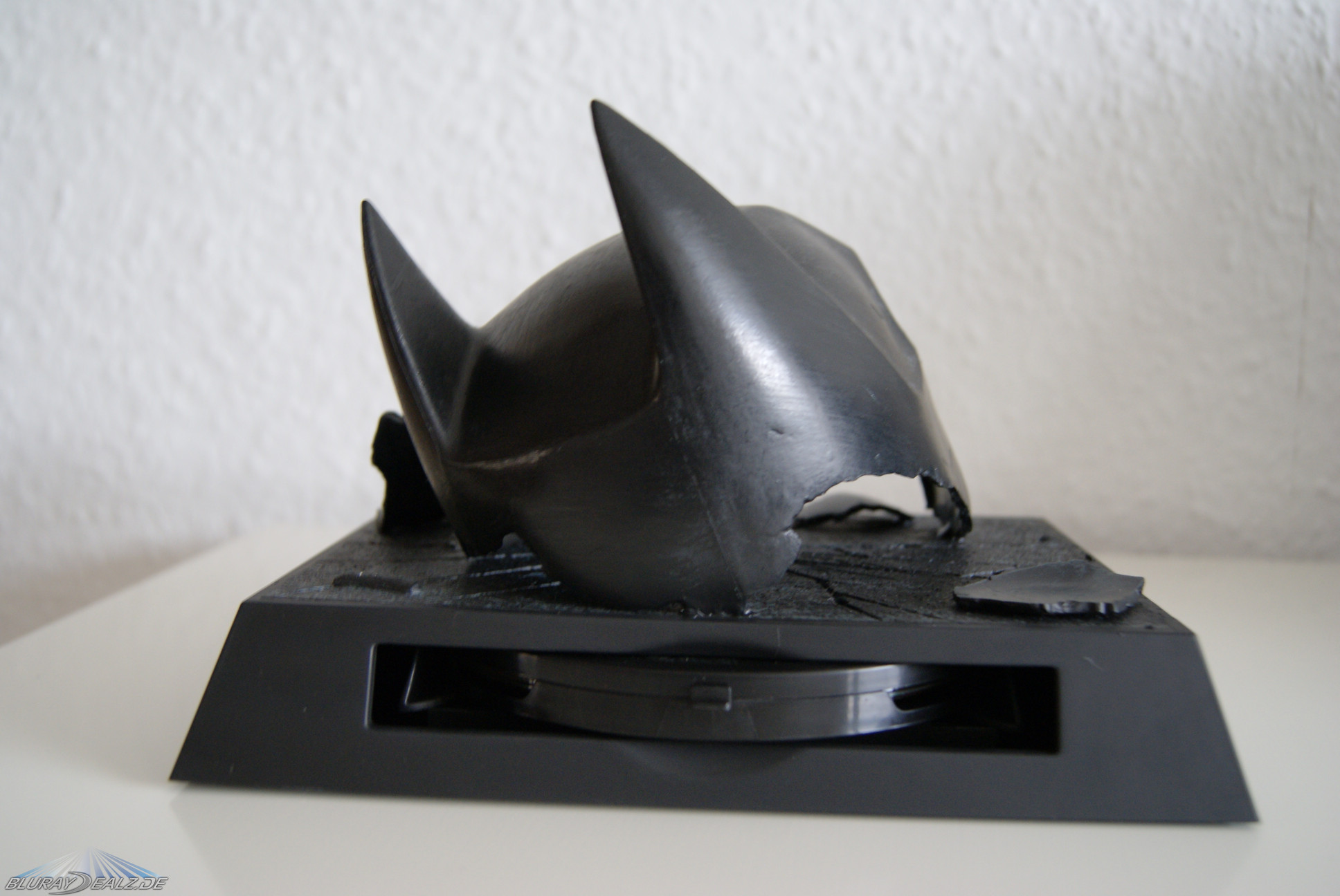 Die Verpackung ist aus bedrucktem Plastik mit recht schönen Motiven an den Außenseiten (Batman und Bane an den Seiten rechts und links, sowie das Batman-Symbol oben). Im Inneren ist Batmans Maske sicher in Plastik verpackt, der Code für die Digitalkopie liegt als Flyer bei. Die Maske inkl. Sockel sind aus Kunststoff aber trotzdem recht schwer (insgesamt mit einem Gewicht von 762g), wobei insbesondere der Sockel sehr gewichtig ist. Die Discs (2x Blu-ray, 1x DVD) sind in einer Art Filmrolle (leider nicht aus Metall, sondern ebenfalls aus Kunststoff) verstaut, die auf der Rückseite im Inneren des Sockels untergebracht ist. Zu beachten ist auch der Druck auf der Unterseite des Sockels, der nochmals das Originalmotiv (nebst Credits) aus dem Film zeigt, dass diesem Kunstwerk hier Vorbild war.