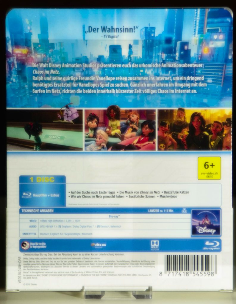 Das Steel ist nach dem Kauf mit einer J-Card ausgestattet, auf dessen Rückseite sich die klassischen Infos (nicht in Schweizerdeutsch) befinden. Die J-Card ebnet damit den Weg, das nichts auf das Steelbook gedruckt wurde. Auf dem Steelbook selbst findet man auf der Front die beiden Hauptcharaktere Ralph und Vanellope. Den silbernen Hintergrund hat man mit leicht gräulichen Leiterbahnen durchzogen, wie man es von einer Platine aus div. technischen Geräten kennt. Auf der Rückseite setzt sich das Hintergrundmuster entsprechend fort. Die drei abgebildeten Charaktere sind weitere Hauptfiguren des Films, die Ralph und Vanellope auf Ihrer Reise durch das Internet begegnen. Auf dem Spine finden wir ebenfalls einige Köpfe wieder, wobei hier ein weiterer Charakter auftaucht der im Film die Suchmaschine darstellte. Einen Filmtitel oder Logo sucht man hier leider vergeblich (komische Mode geworden bei einigen Steelbooks). Im Inneren des Steelbook findet man über beide Seiten einer der wohl originellsten Szenen als Motiv wieder, die Begegnung aller Disney Prinzessinnen mit der „etwas anderen“ Vanellope (Schön, das man sich bei Disney auch selbst aufs Korn nehmen kann). Die Disc ist ebenfalls bedruckt mit beiden Hauptcharakteren.