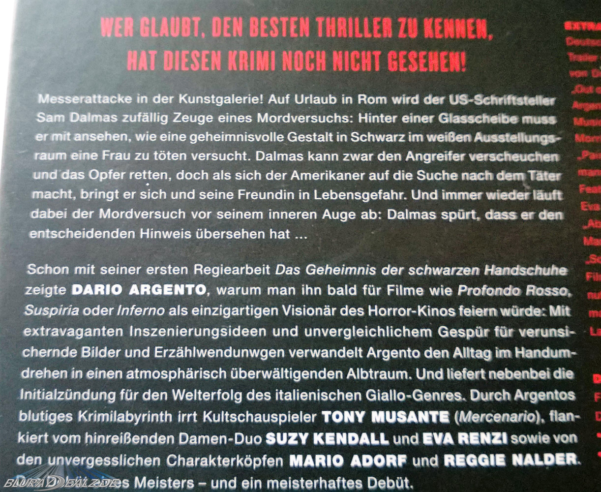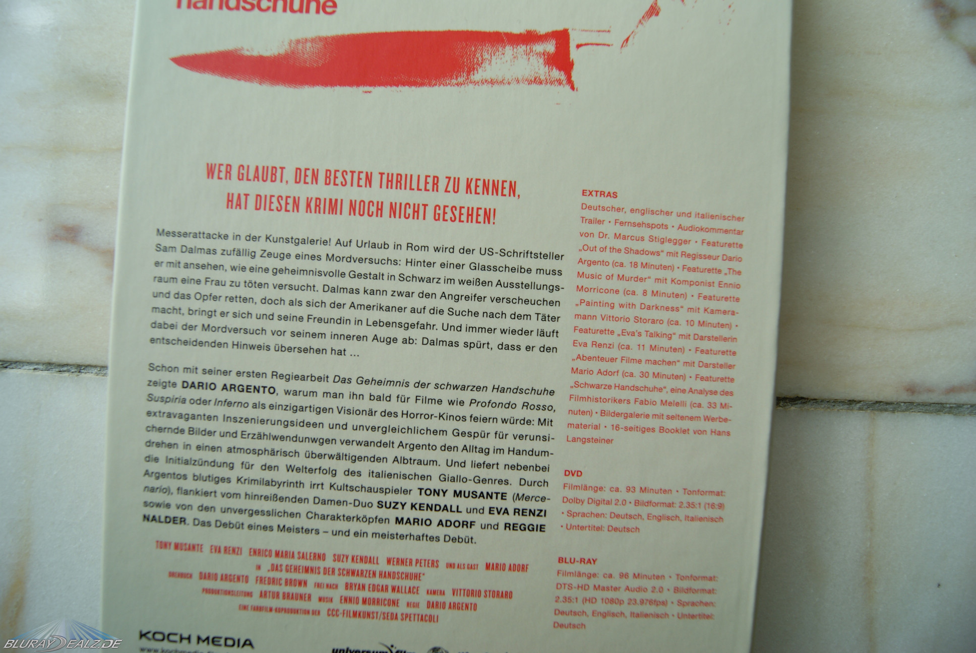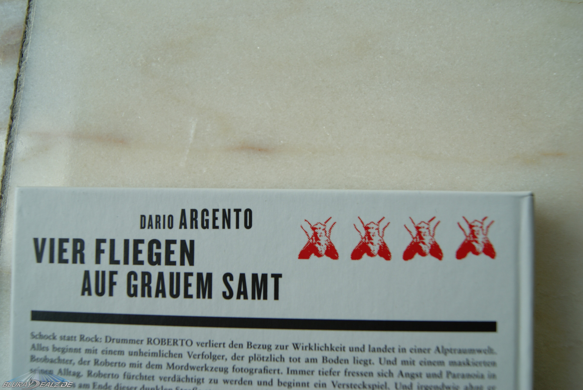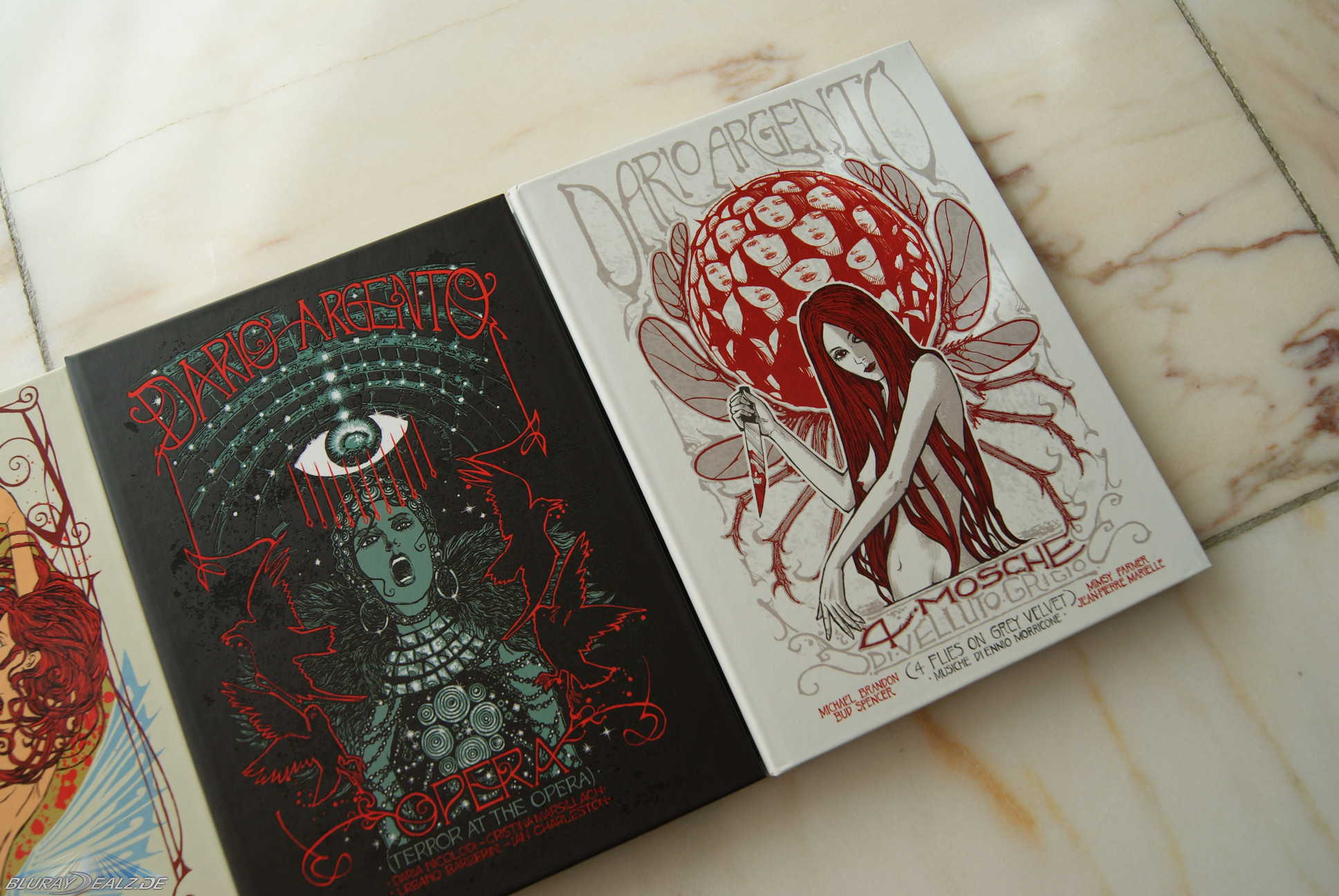 Der Aufbau der Front ist steht der Gleiche. Oben steht der Schriftzug „Dario Argento“, darunter befindet sich das Motiv, darunter in großen Lettern der Originaltitel, darunter kleiner der Titel in Englisch und wiederum kleiner darunter die Riege der Schauspieler (bei den „Handschuhen“ und den „Fliegen“ ergänzt um die Angabe, dass die Musik von Ennio Morricone stammt). Die Oberfläche der Mediabooks ist leicht wachsartig.