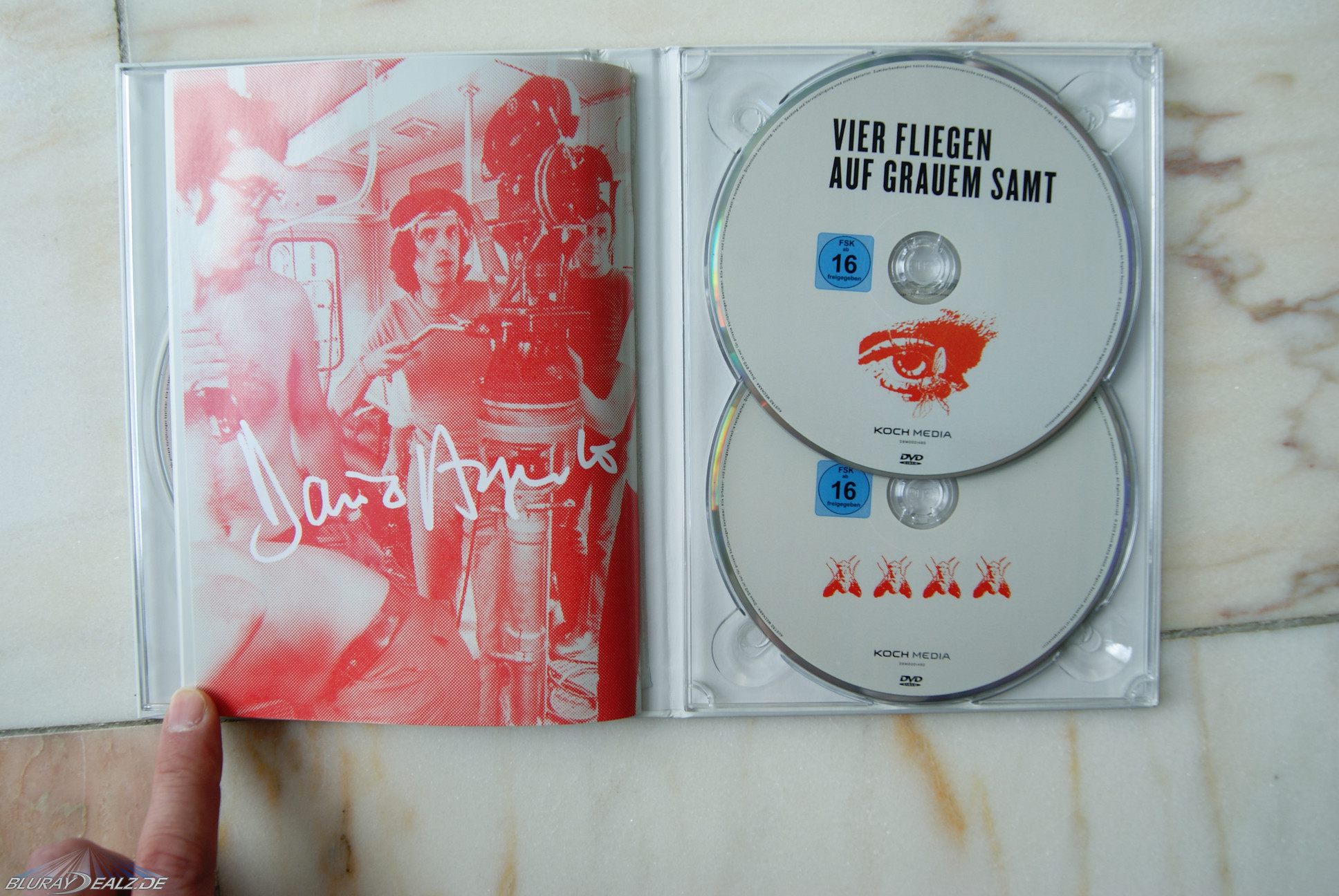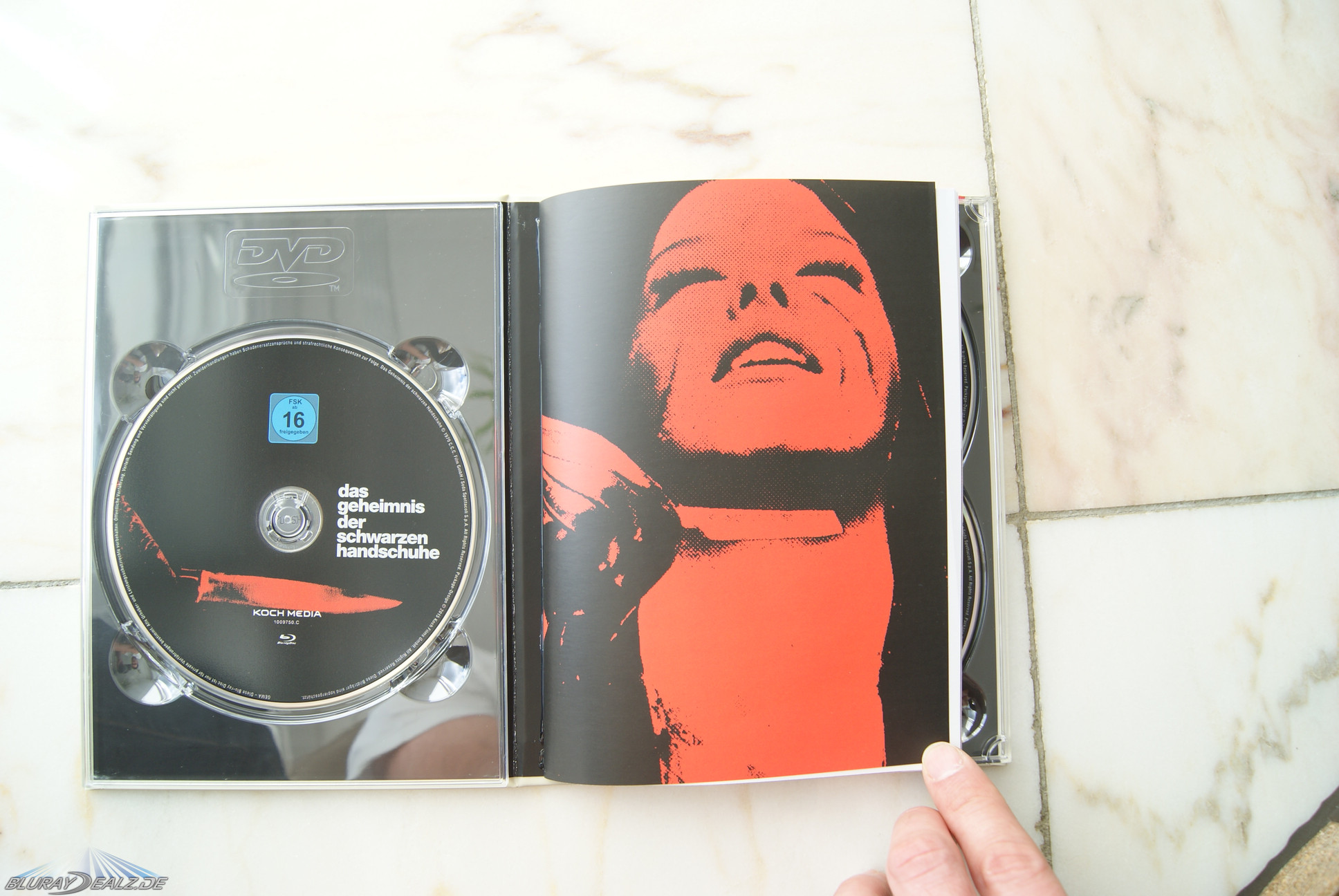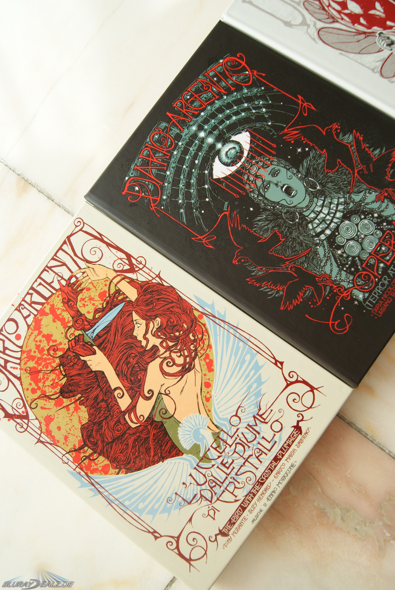 Der Aufbau der Front ist steht der Gleiche. Oben steht der Schriftzug „Dario Argento“, darunter befindet sich das Motiv, darunter in großen Lettern der Originaltitel, darunter kleiner der Titel in Englisch und wiederum kleiner darunter die Riege der Schauspieler (bei den „Handschuhen“ und den „Fliegen“ ergänzt um die Angabe, dass die Musik von Ennio Morricone stammt). Die Oberfläche der Mediabooks ist leicht wachsartig.