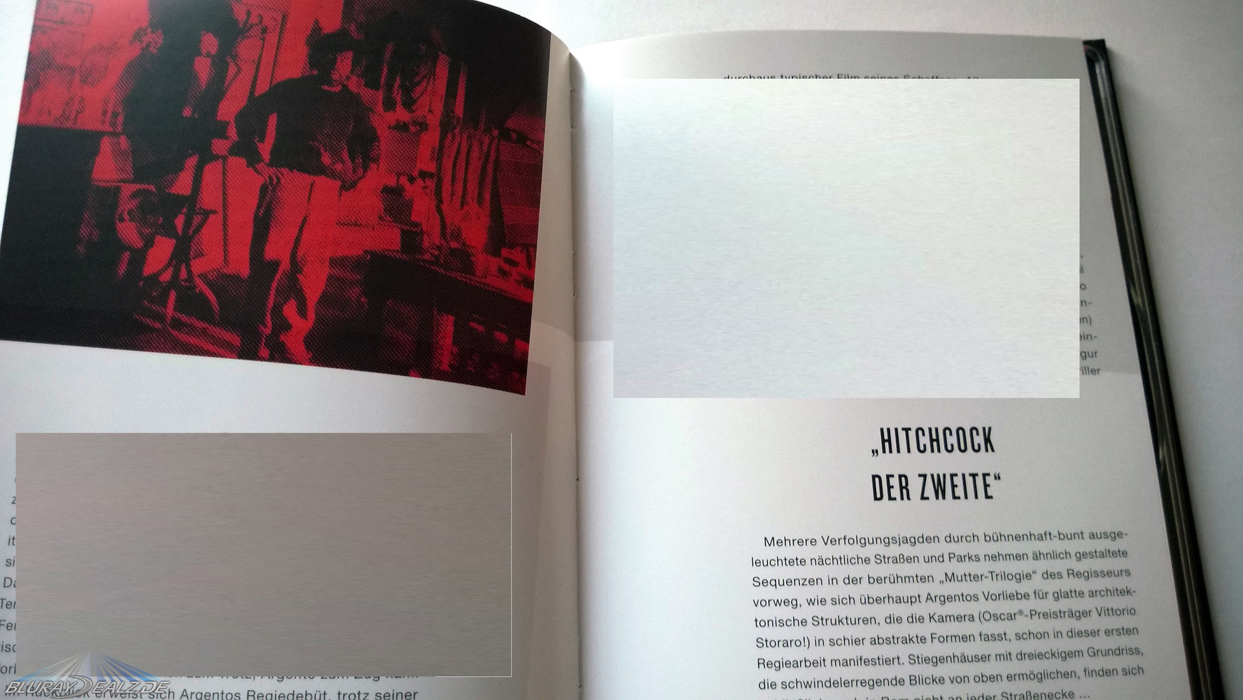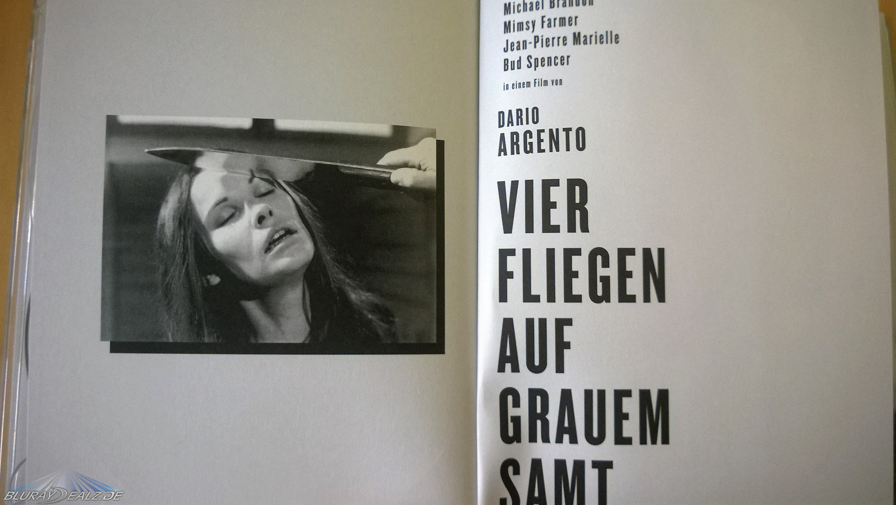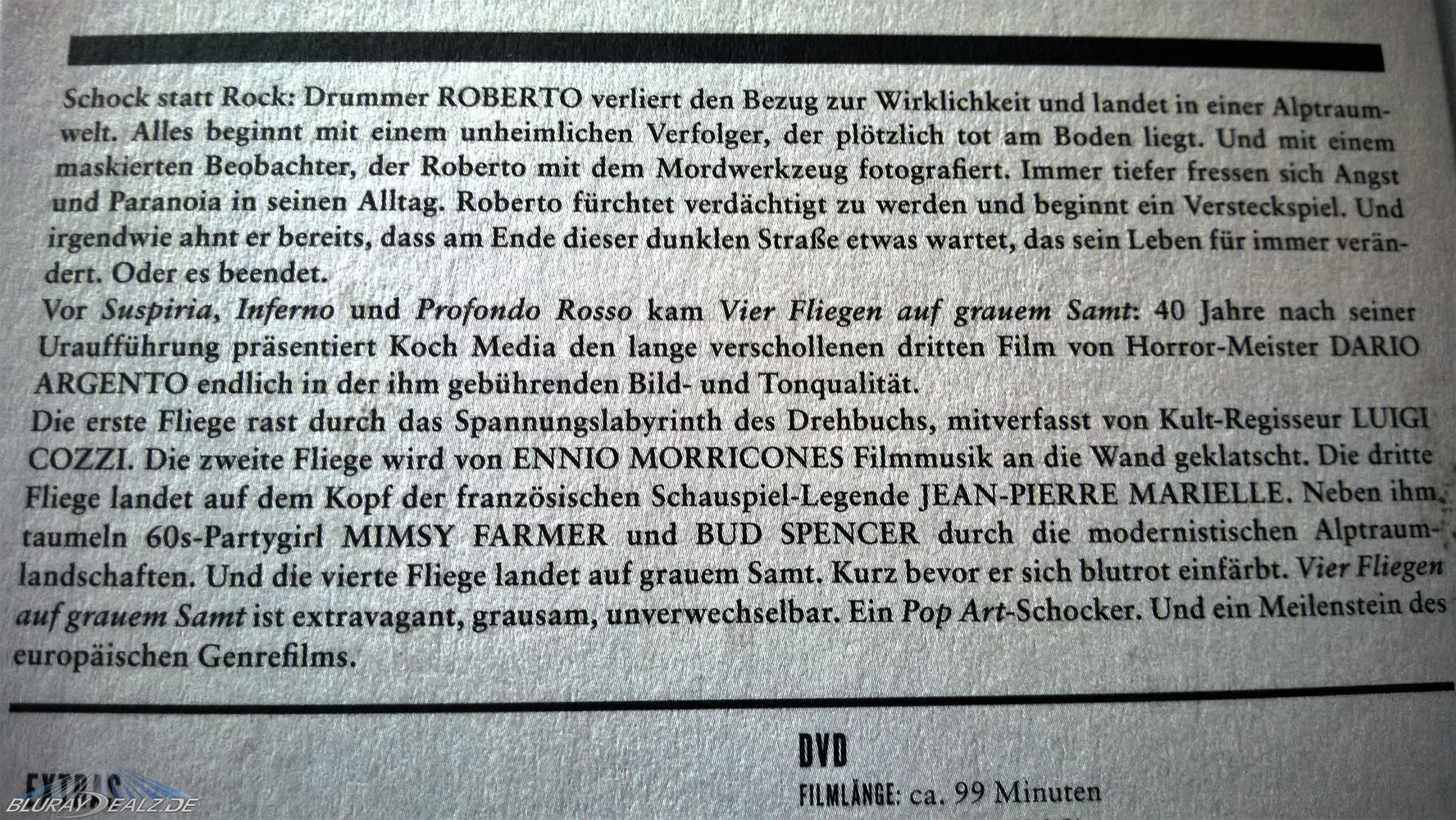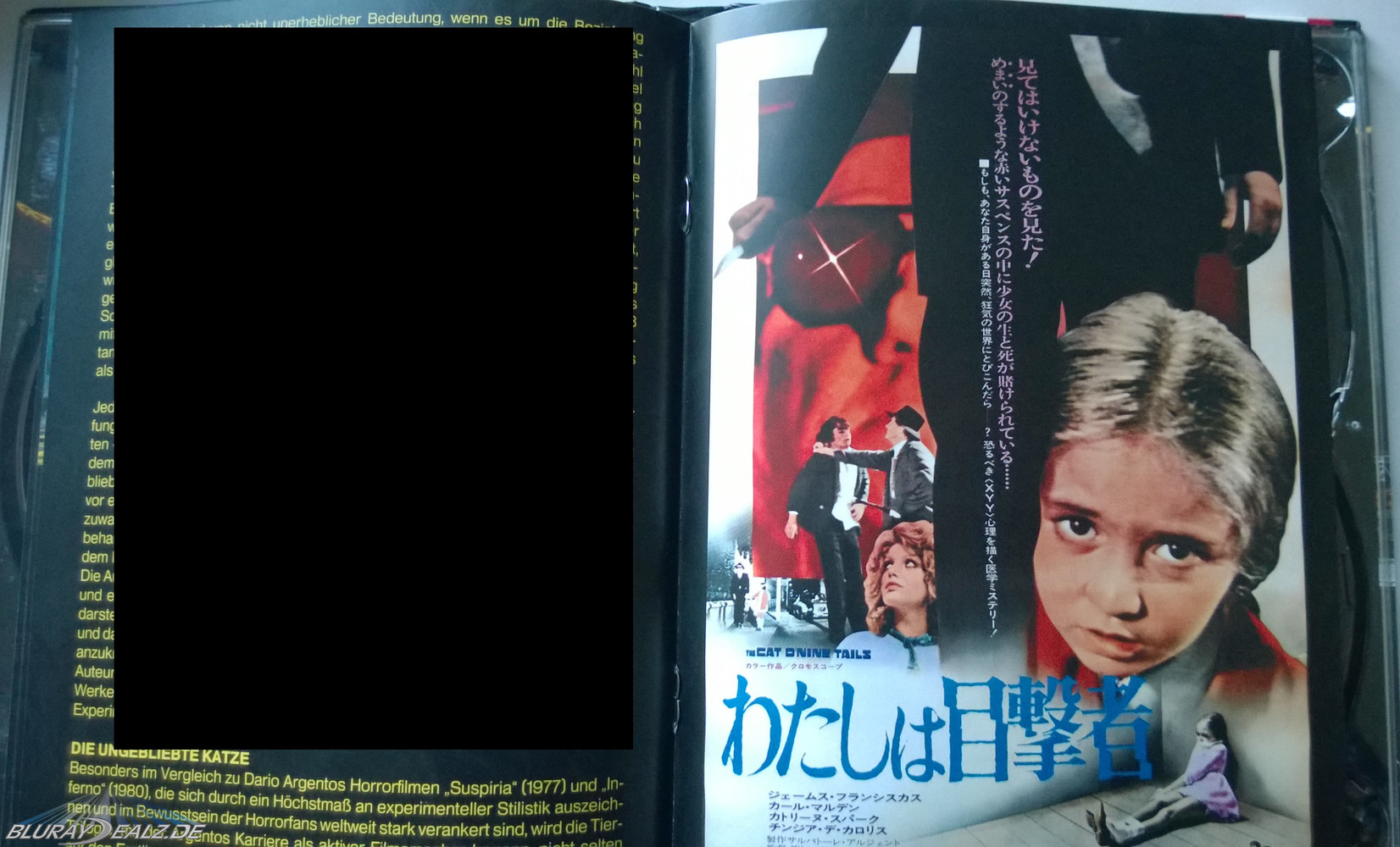 Der Aufbau der Front ist steht der Gleiche. Oben steht der Schriftzug „Dario Argento“, darunter befindet sich das Motiv, darunter in großen Lettern der Originaltitel, darunter kleiner der Titel in Englisch und wiederum kleiner darunter die Riege der Schauspieler (bei den „Handschuhen“ und den „Fliegen“ ergänzt um die Angabe, dass die Musik von Ennio Morricone stammt). Die Oberfläche der Mediabooks ist leicht wachsartig.