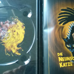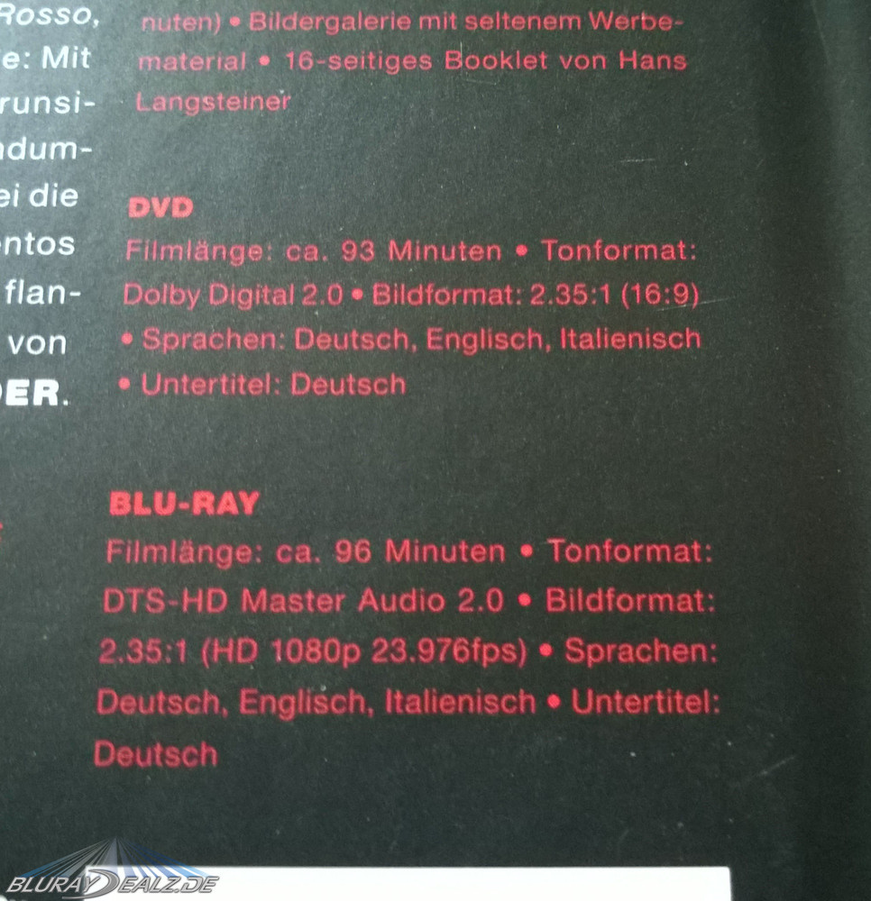 Der FSK-Flatschen befindet sich auf der Einschweißfolie. Spine und Back sind identisch mit der Erstauflage nur in inverser Farbe (Vorher weiße Schrift auf schwarzem Grund, jetzt schwarze Schrift auf hellem Grund). Gleich ist der Discdruck, nur haben die Blu-ray und die DVD´s den Platz gewechselt, auch wieder mit dem interessanten Fakt, dass das DVD-Logo auf dem Blu-ray-Tray ist. Auch der Buchteil scheint identisch – mit einem ärgerlichen Unterschied. Die beiden Szenenfotos, die sich auf der vorletzten Seite in der Erstauflage befanden, fehlen hier. Scheint ein Fehler zu sein.