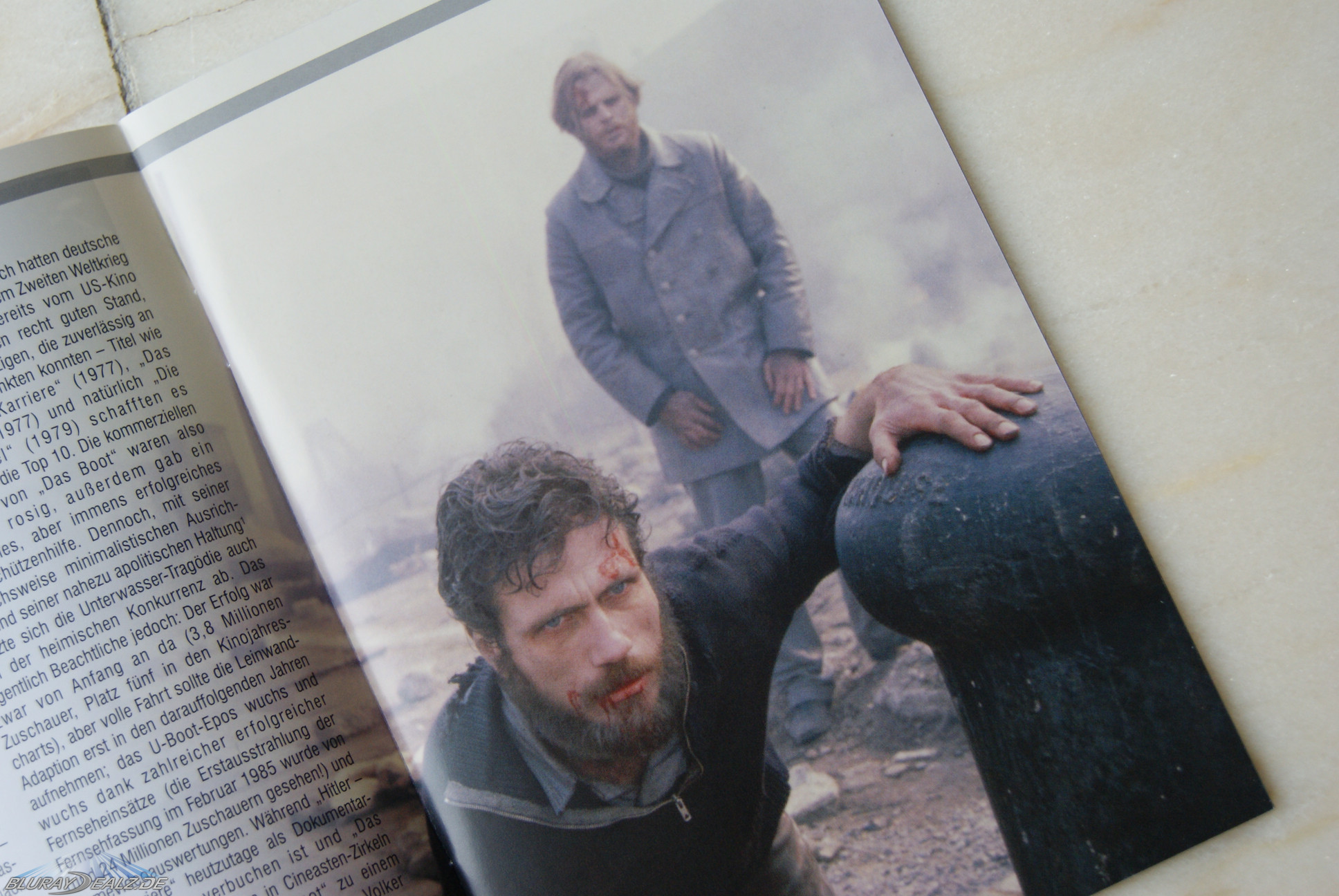 Der FSK-Flatschen ist auf der Einschweißfolie untergebracht. Entfernt man diese, kann man die lediglich umgelegte und nicht befestigte J-Card abnehmen. Diese enthält auf der Rückseite sämtliche wichtigen Information wie Specs, und Inhalt. Der Schuber zeigt vorne und hinten stimmige s/w Motive des U-Bootes in stürmischer See. Im Inneren befindet sich das mehrfach aufklappbare DigiPack mit vielen tollen s/w-Motiven. Alle acht Discs befinden sich in Doppelpacks vertikal versetzt auf einer Seite. Ganz links befindet sich eine Lasche, in dem das reich bebilderte Booklet befindet. Eine tolle Edition, die auf ihren fünf Blu-ray´s den Film in der Kinofassung, im Directors Cut, im Serienformat und eine Bonus-Disc enthält. Zudem sind noch drei CDs dabei (Soundtrack und Hörbuch). Was für ein Paket !