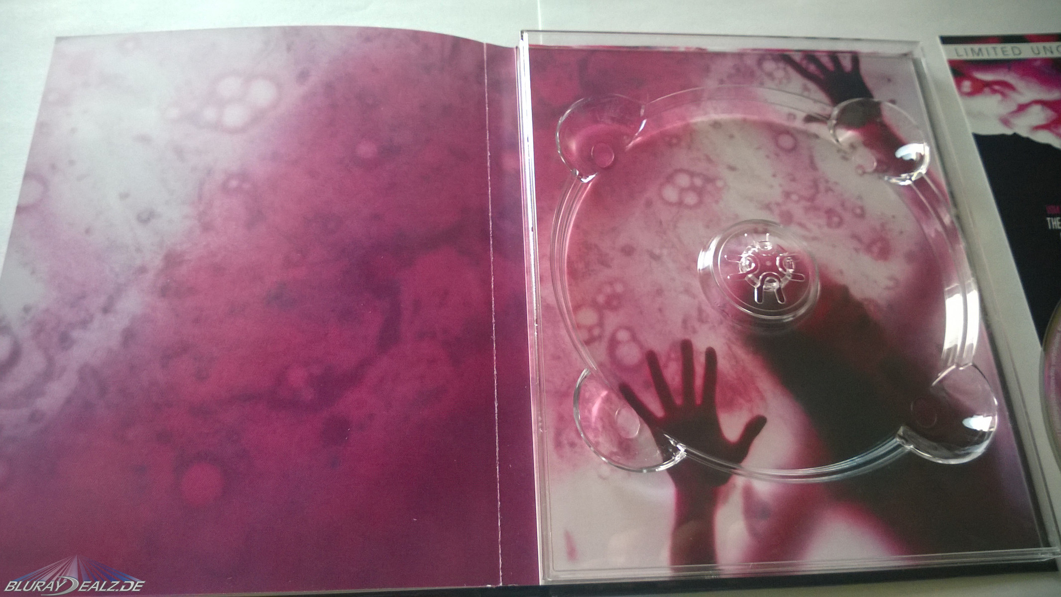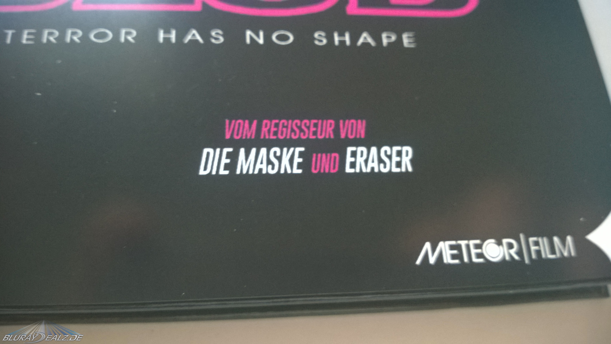 Die Karte ist nur aufgelegt und nicht geklebt, passt ins Mediabook rein und hat durch das Retro – FSK – Siegel schonmal Sammlerherzen zum Schmelzen gebracht. Der LIMITED Schriftzug befindet sich auch nur auf dem Papier und nicht auf der Front selber, diese ist komplett Werbetextfrei und kommt international „Terror has no shape“ daher. Das MB ist glänzend gehalten und hat keinerlei Effekte, was aber nicht stört, da der Druck super ist. Hinten drauf befinden sich Information sowie Fotos vom Film.