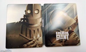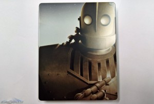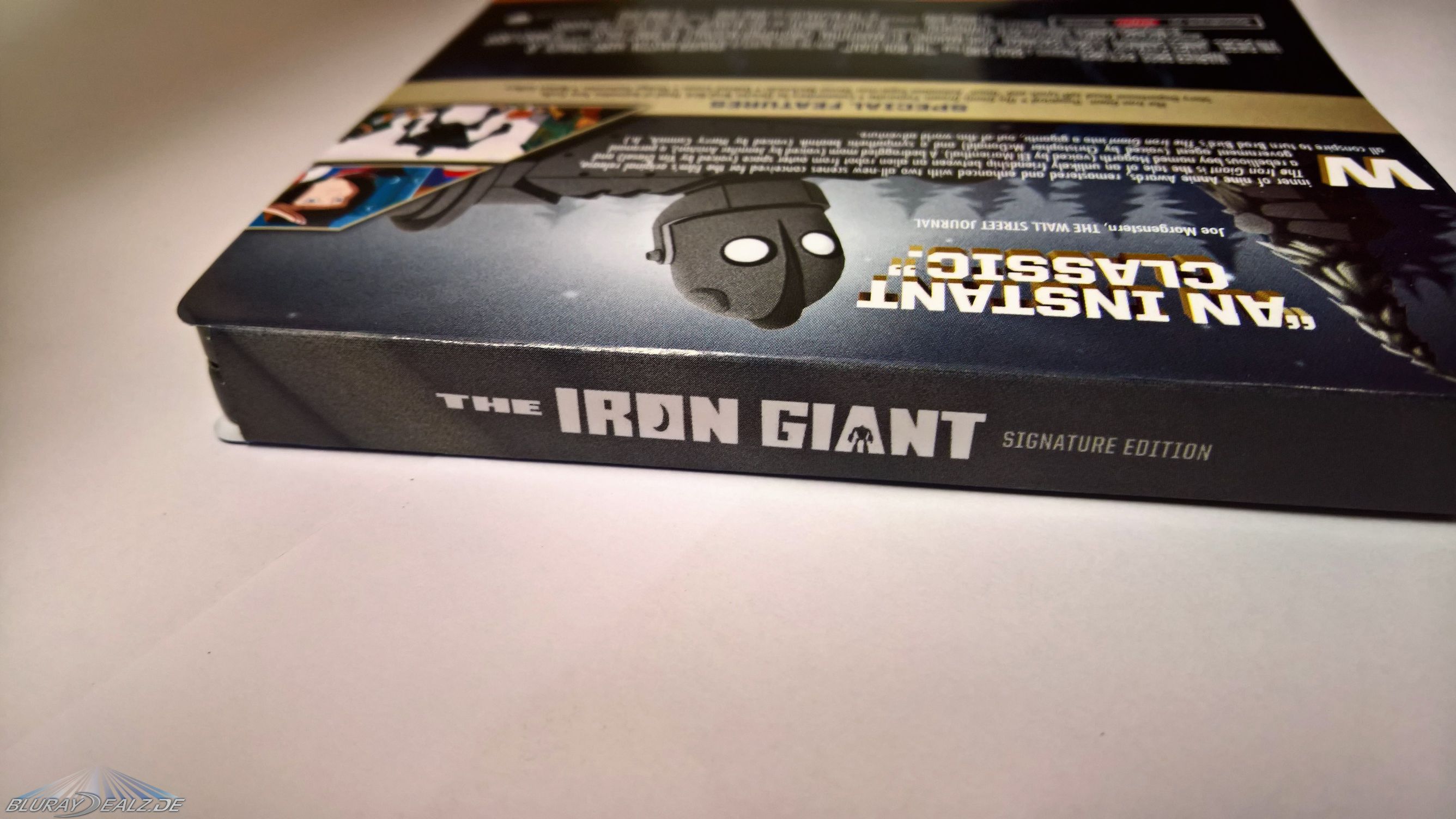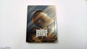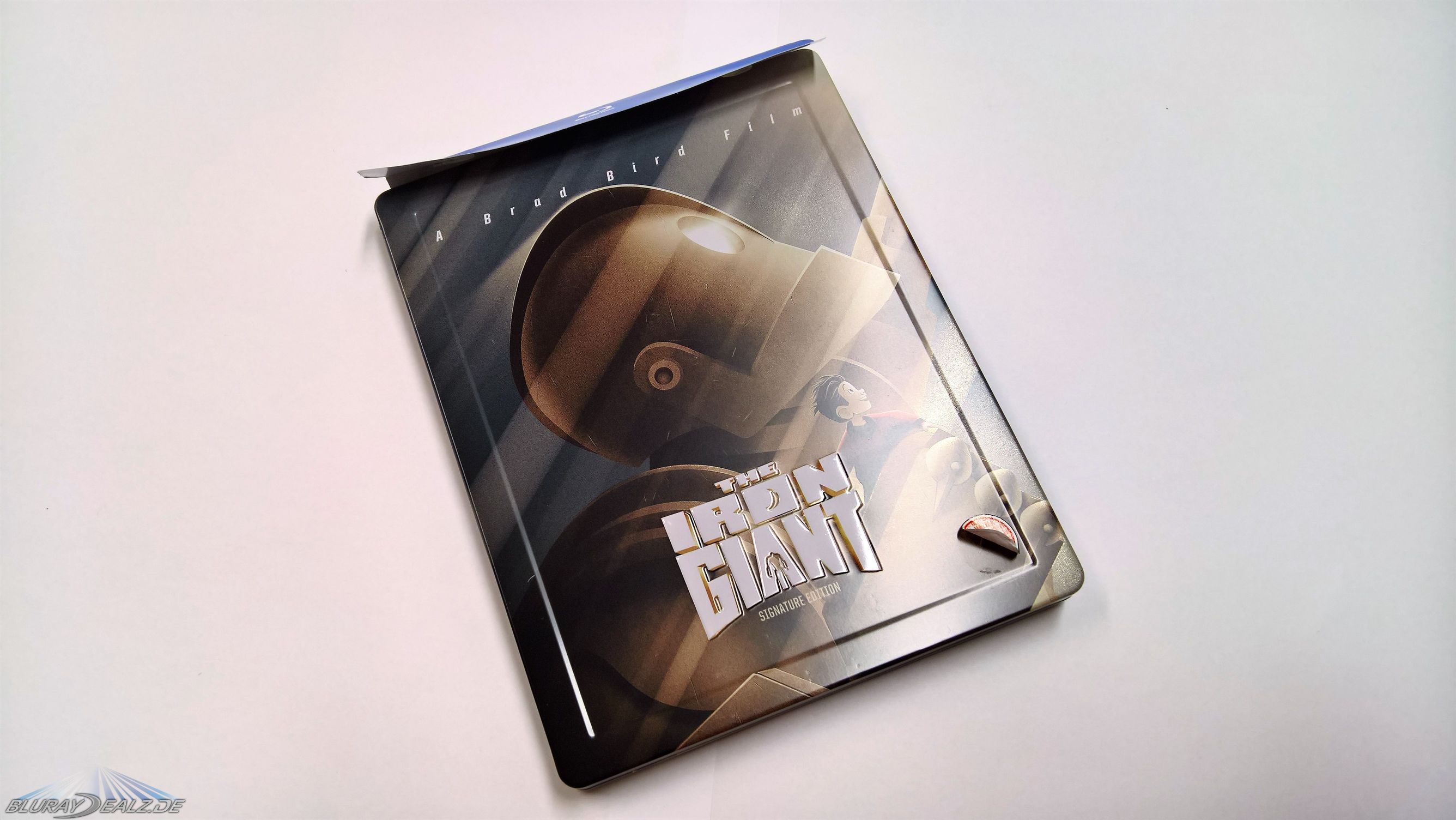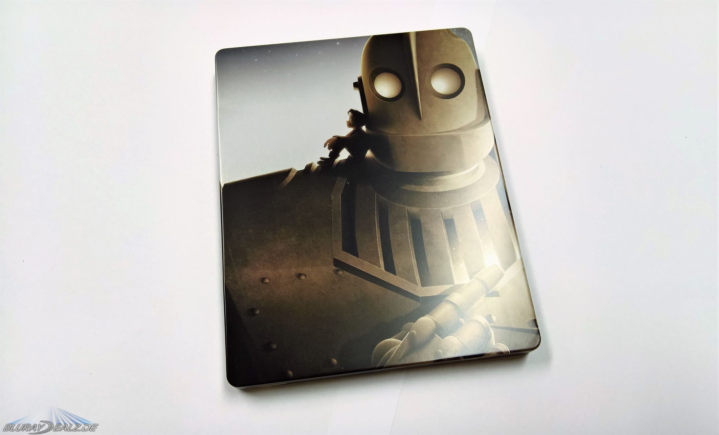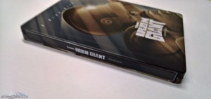 Nachdem wir die Folie und die mit Klebepunkten versehene J-Card entfernt haben, erstrahlt uns der geprägte Iron Giant Titel in seinem Spotgloss an. Der Rest der Front ist in nostalgischen graublaubrauntönen gehalten. Der Metallicshimmer im Hintergrund kommt gut. Auf den Fotos mag es aussehen als ob das Steel vermackelt ist, ist es aber nicht, es ist der rostige Kollege, der die Kratzer aufweist.