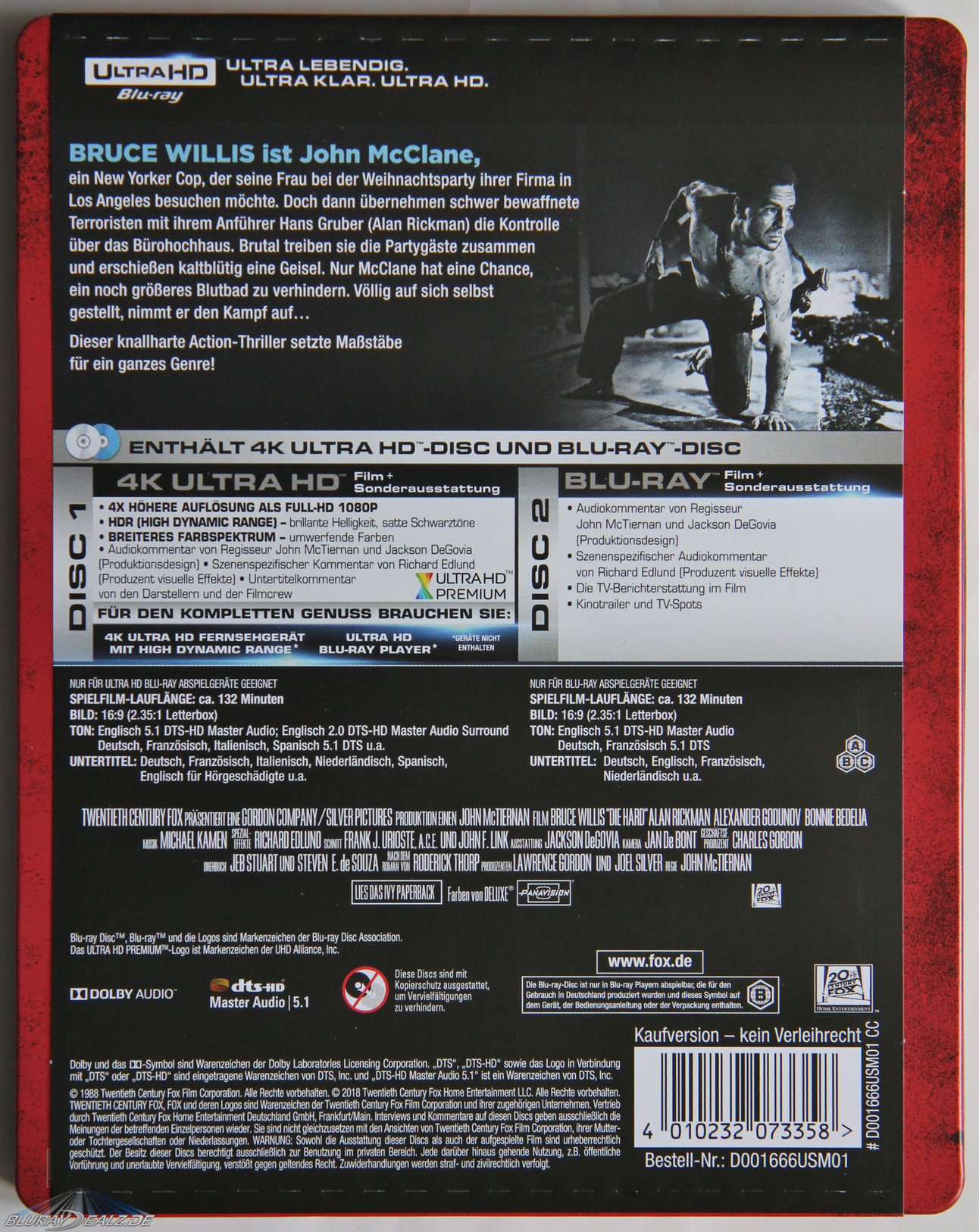 Der Innendruck ist dann wahrlich Pop Art-mäßig, dafür wählte man aber ein stimmiges Motiv: die blutigen Fußspuren McClanes. Passt sehr zum Gesamtdesign und ist nicht einfarbig. Außerdem ist der Druck sehr gelungen und alles ist gestochen scharf – im Gegensatz beispielsweise zum Gladiator-Innendruck. Enthalten sind die alte Blu-ray und die neue UHD-Scheibe, die bildtechnisch eine deutliche Verbesserung zur Schau stellt und man kann hier problemlos sagen: besser sah der Film noch nie aus. Nicht nur HDR überzeugt, auch der Detailgrad nimmt sichtbar zu. Für alle Fans mit 4K-Equipment also ein Pflichtkauf! Nach meiner anfänglichen Skepsis gegenüber dem Steelbook muss ich sagen, dass es mir live doch wider Erwarten sehr gut gefällt – nicht zuletzt dank eines sehr poppenden Rots. Auch wenn designtechnisch mehr drin war. Die Verarbeitung des Steelbooks ist insgesamt sehr hochwertig.