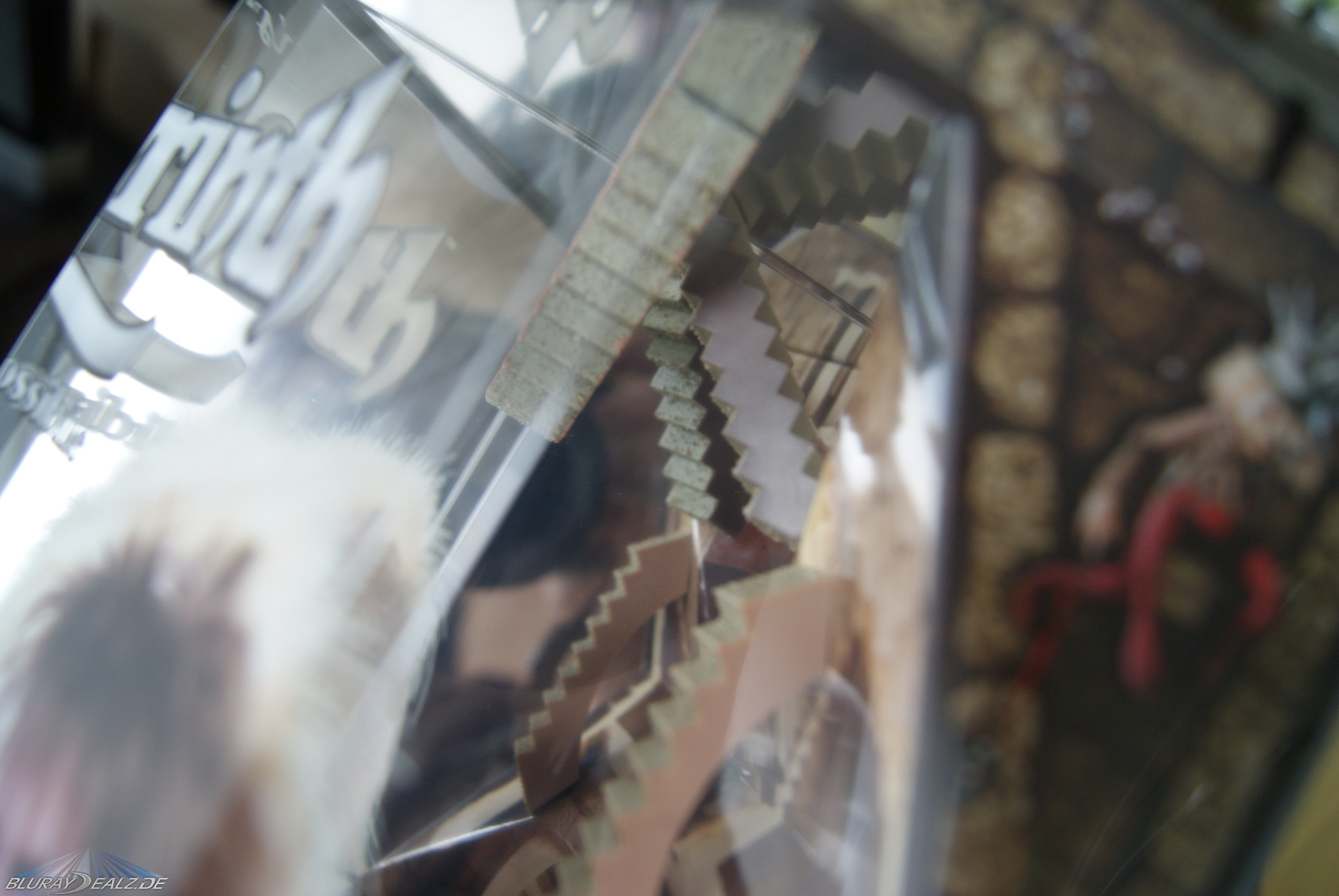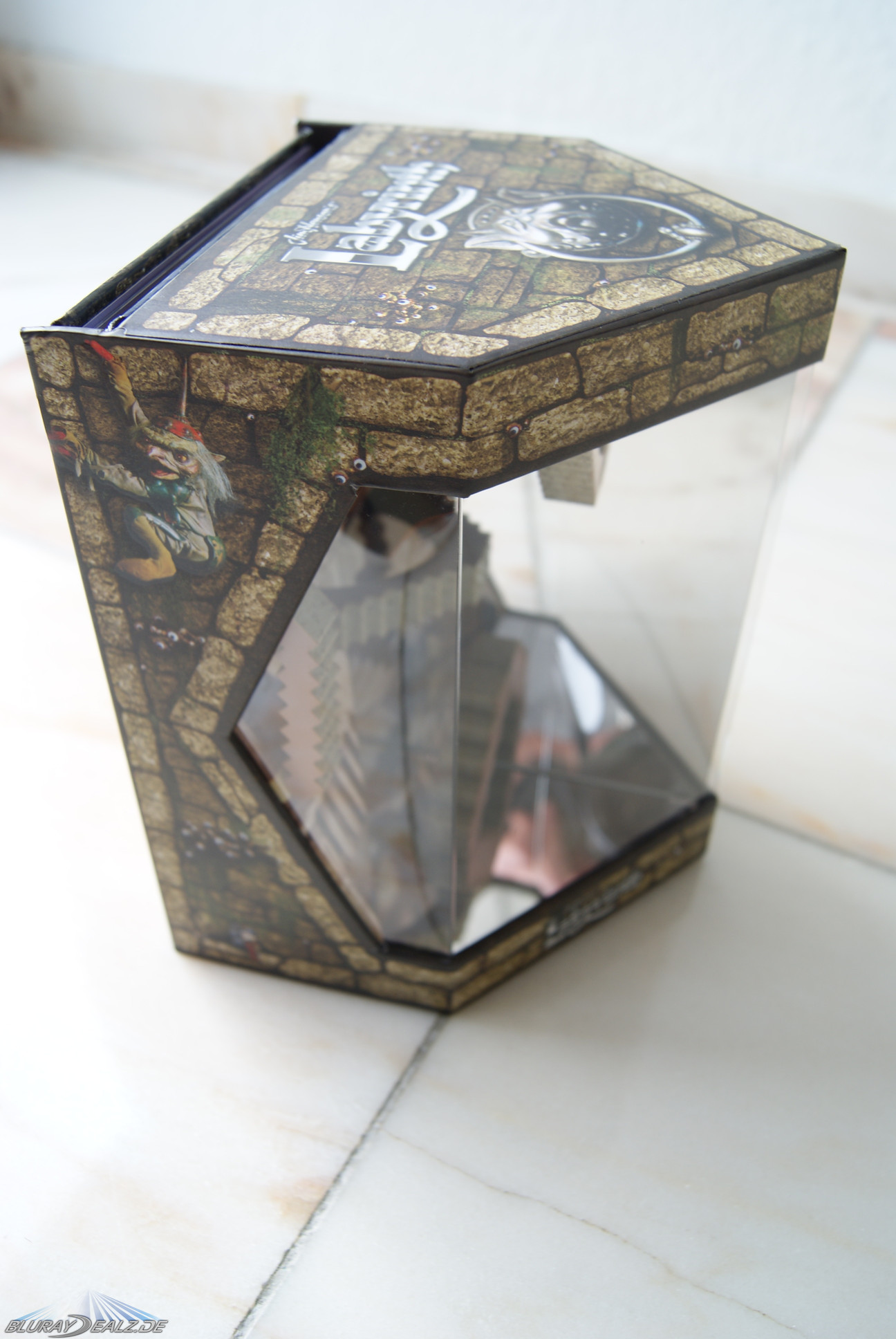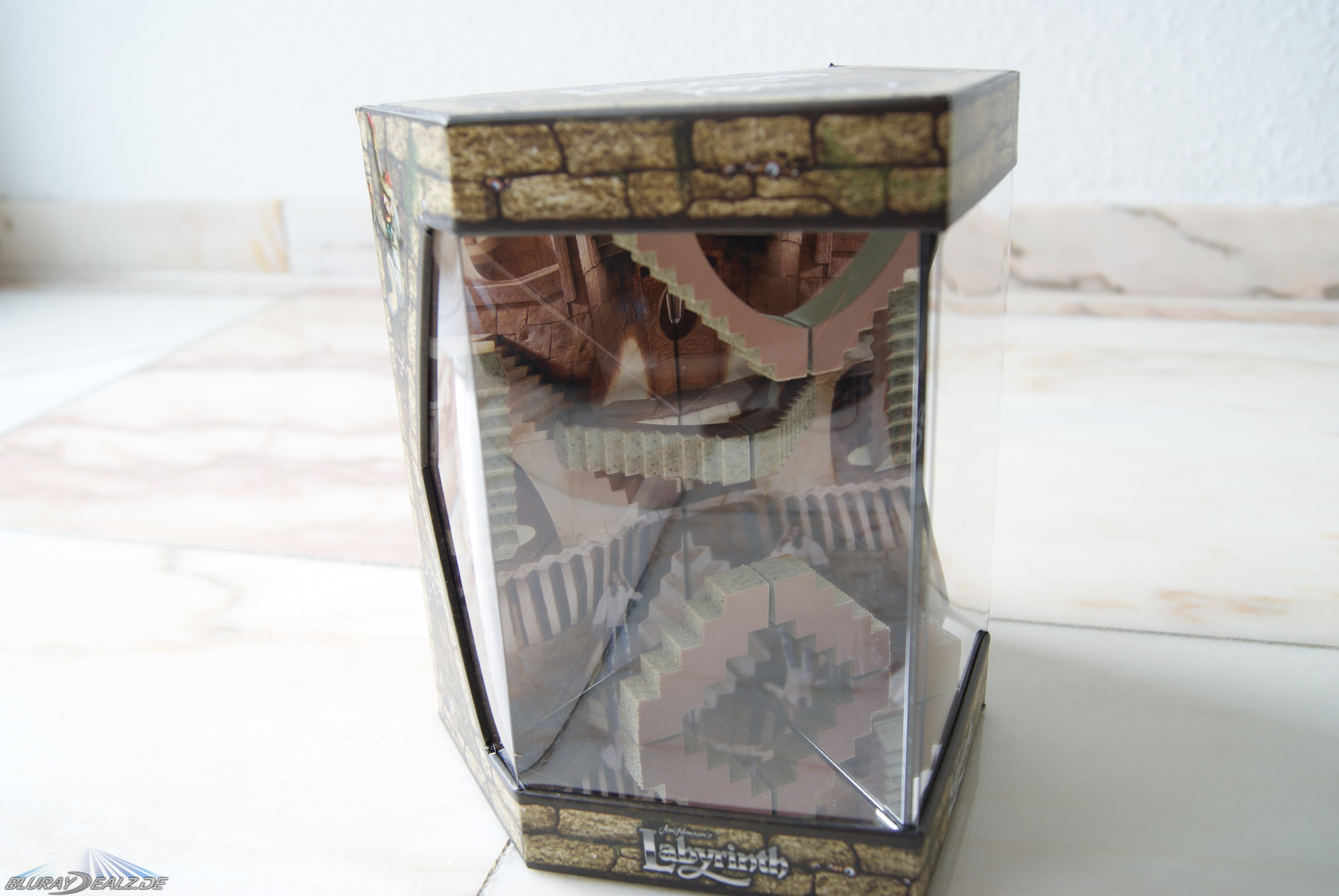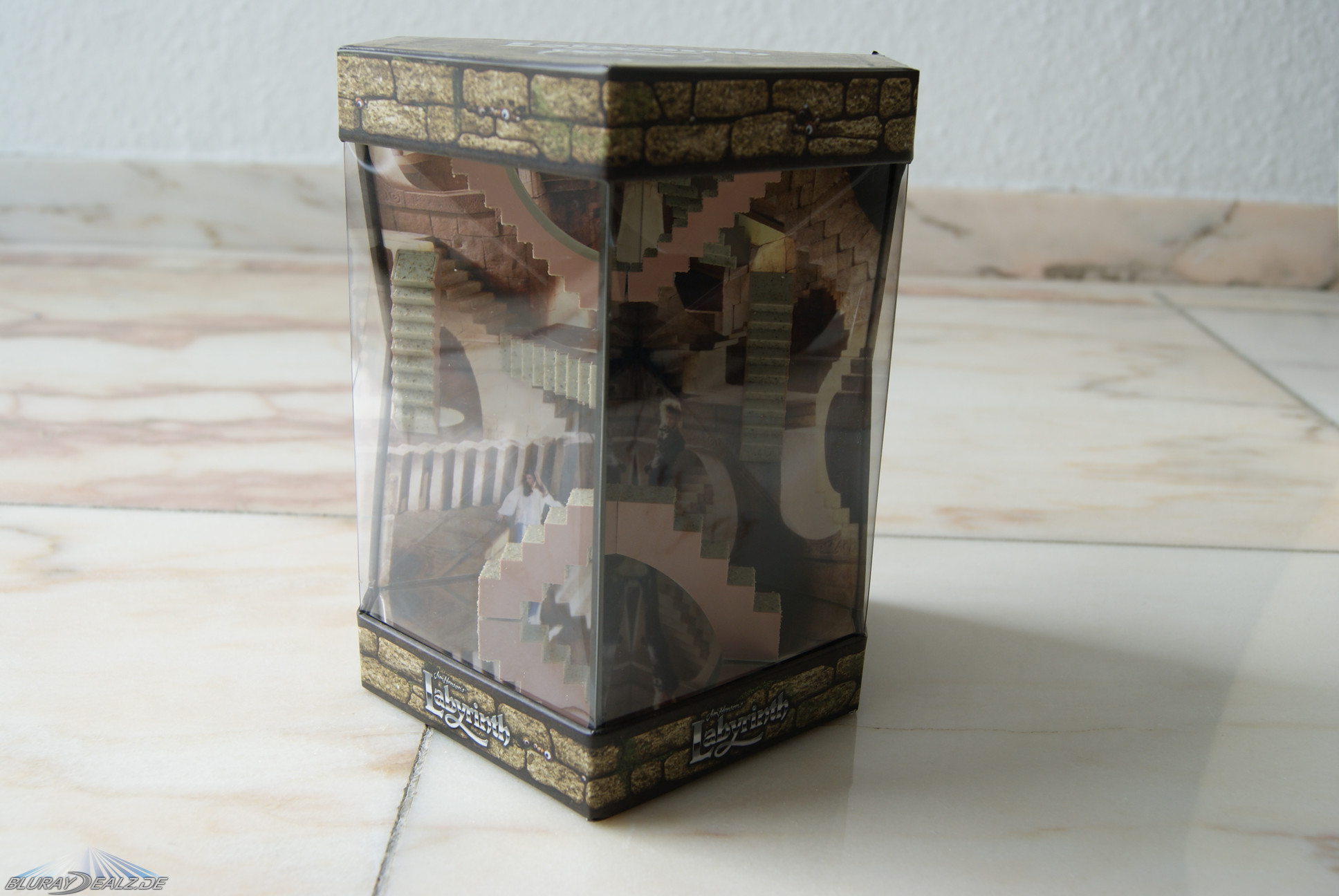 Hinter einer großen Lage Luftpolsterfolie (das nenne ich mal sicher verpackt) taucht die Edition in einer bedruckten Plastikhülle (in der Form der Edition) auf und zeigt hier schon was sie bietet. Auf der Rückseite sind alle Daten zu der Edition untergebracht, so dass nach Auspacken aus der Hülle die Figur ohne störenden Text daherkommt. Sie besteht aus sehr stabiler Pappe und bietet sehr viel Spotgloss (diverse Figuren und alle „Labyrinth“-Schriftzüge. Vorne kann man einen Blick auf das wundervoll gestaltete Treppen“labyrinth“ aus dem Film werfen. Durch angebrachte Spiegel wirkt dies wunderbar irreal. Stark gemacht.
