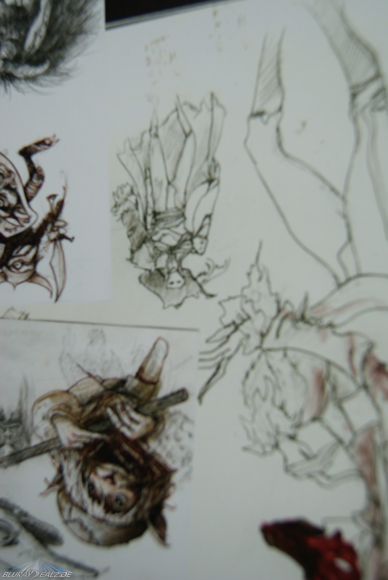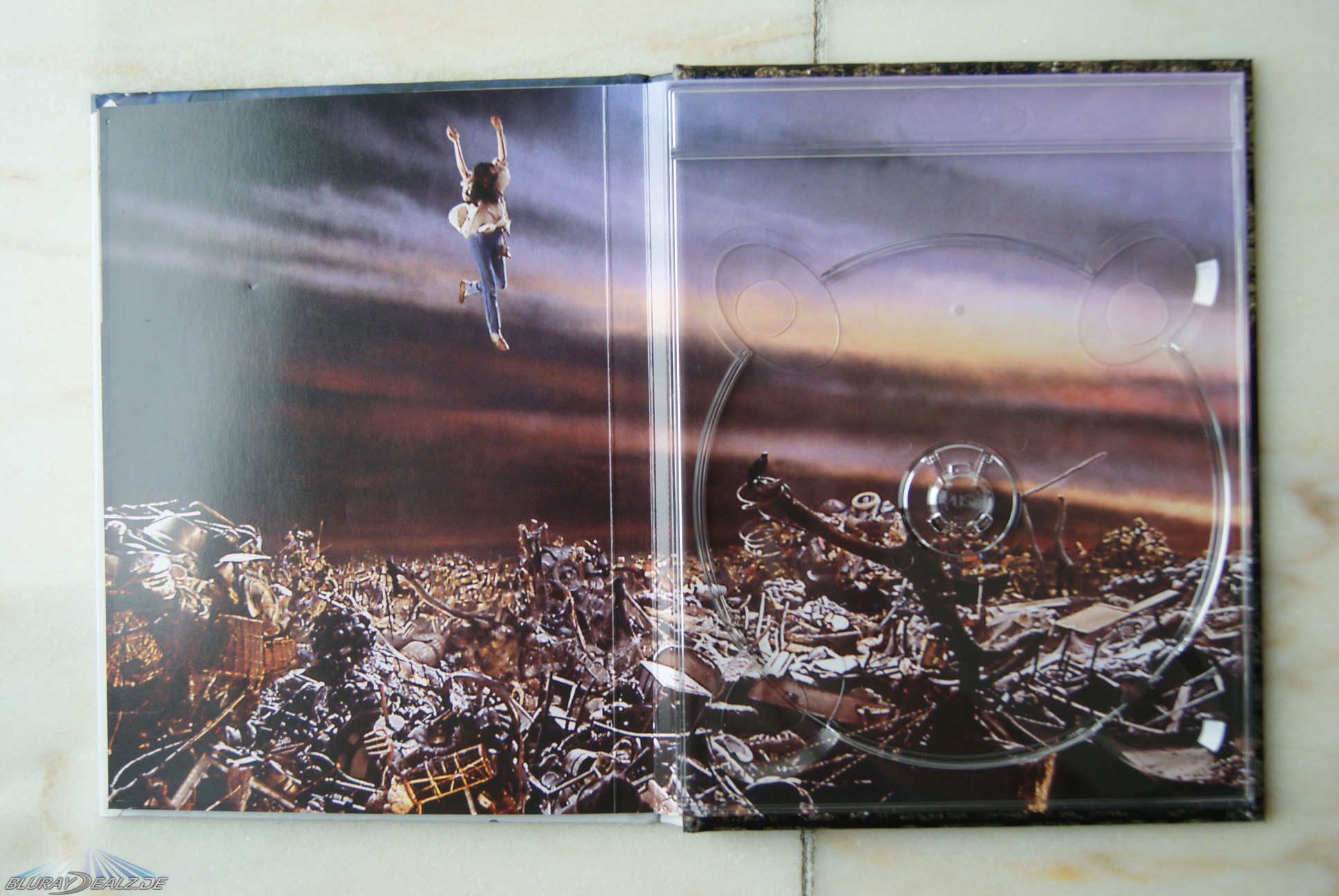 In einer Aussparung im hinteren Bereich der Figur ist das Mediabook untergebracht, das vorne ebenfalls Spotgloss hat (Titel und Kugel) und ein wundervolles klassisches Design. Hinten sind leider Text und nur kleine Motive. Im Inneren befindet sich die Disc rechts – nach Herausnehmen sieht man ein tolles doppelseitiges Motiv (wie auch auf den ersten beiden Seiten des Booklets.). Das Booklet besteht aus stabilen, hochglänzenden Pappseiten und bietet viele Bilder, Konzeptzeichnungen und einige Abdrucke von Originaltexten. Zudem noch sehr viele Infos, die in meiner Auflage leider in italienisch sind (also in Deutschland kaufen, wenn man den Text verstehen will und nicht italienisch kann). .