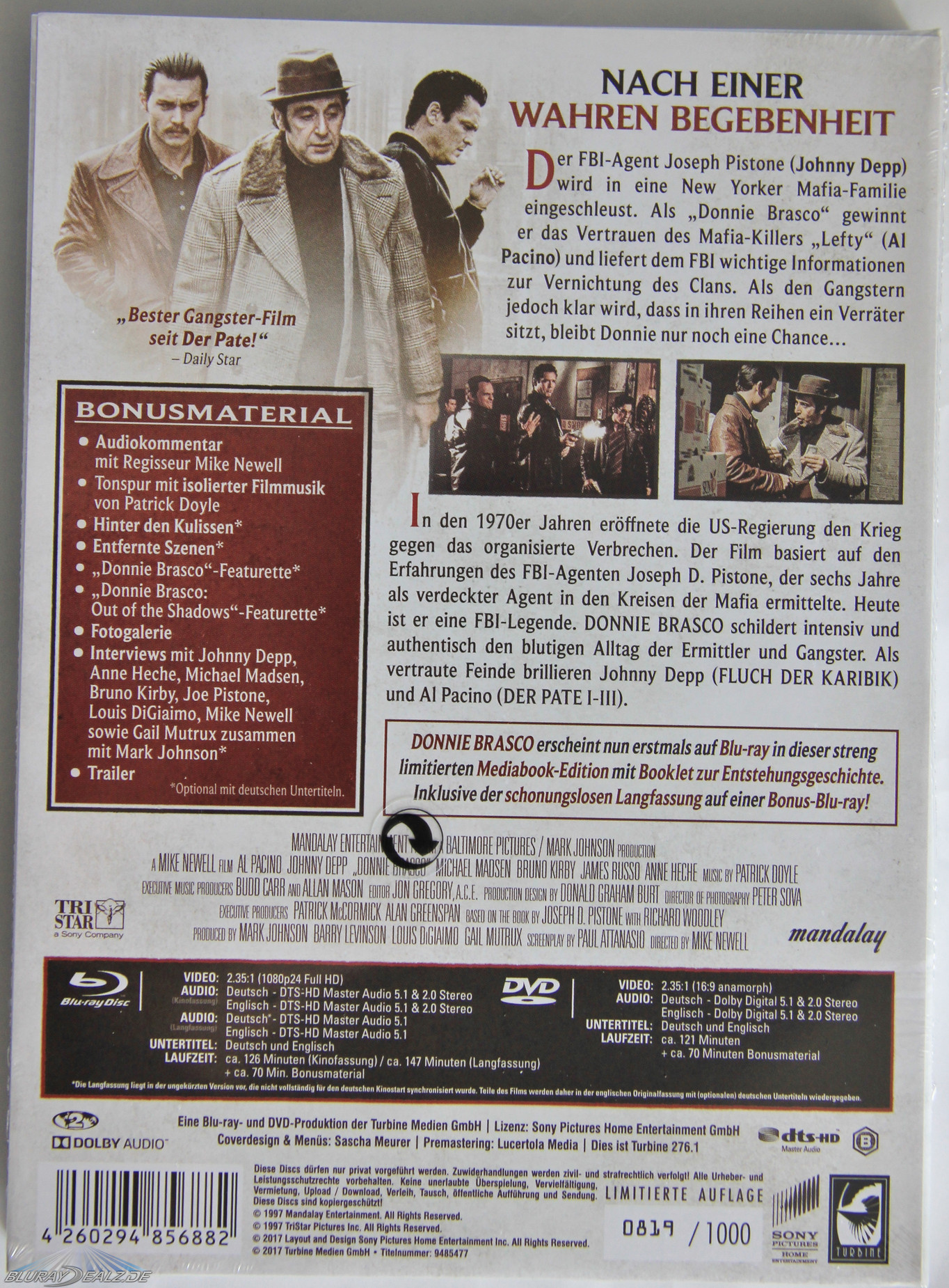 Turbine Medien veröffentlicht am 07.04.2017 den Genre-Tipp „Donnie Brasco“ erstmals in der Extended Fassung auf Blu-ray und spendiert dem Film auch noch zwei schicke Mediabooks, welche jeweils inhaltsgleich sind, aber verschiedene Designs aufweisen. Cover A (auf 2000 Stück limitiert) ist dabei in schwarz gehalten und zeigt das altbekannte Postermotiv, während Cover B (auf 1000 Stück limitiert) in weiß daherkommt. Preislich liegt das Release bei knapp unter 30€, bei Media-Dealer lässt sich die Edition für 26,97€ + VK bestellen (Go to Deal-Link).
