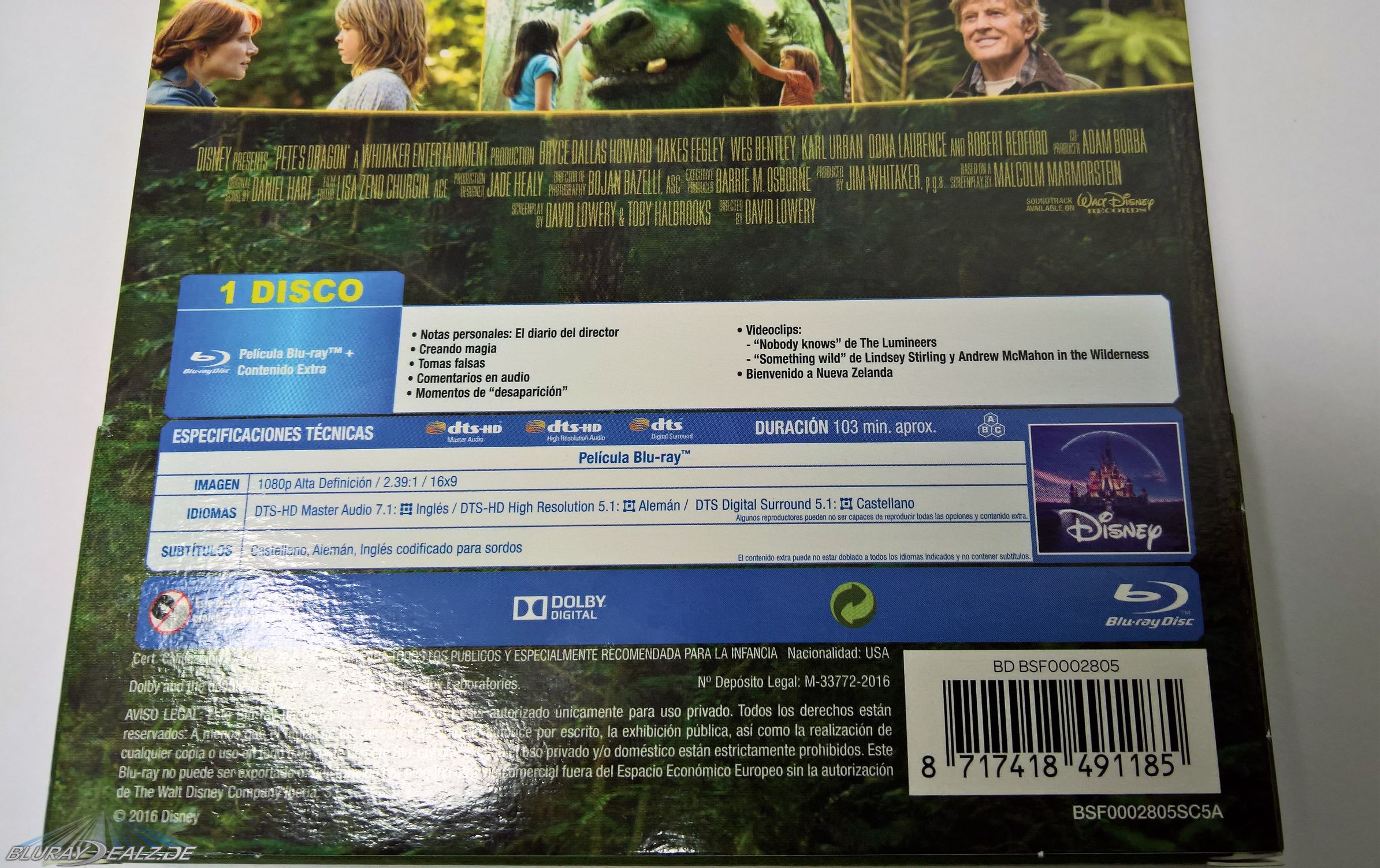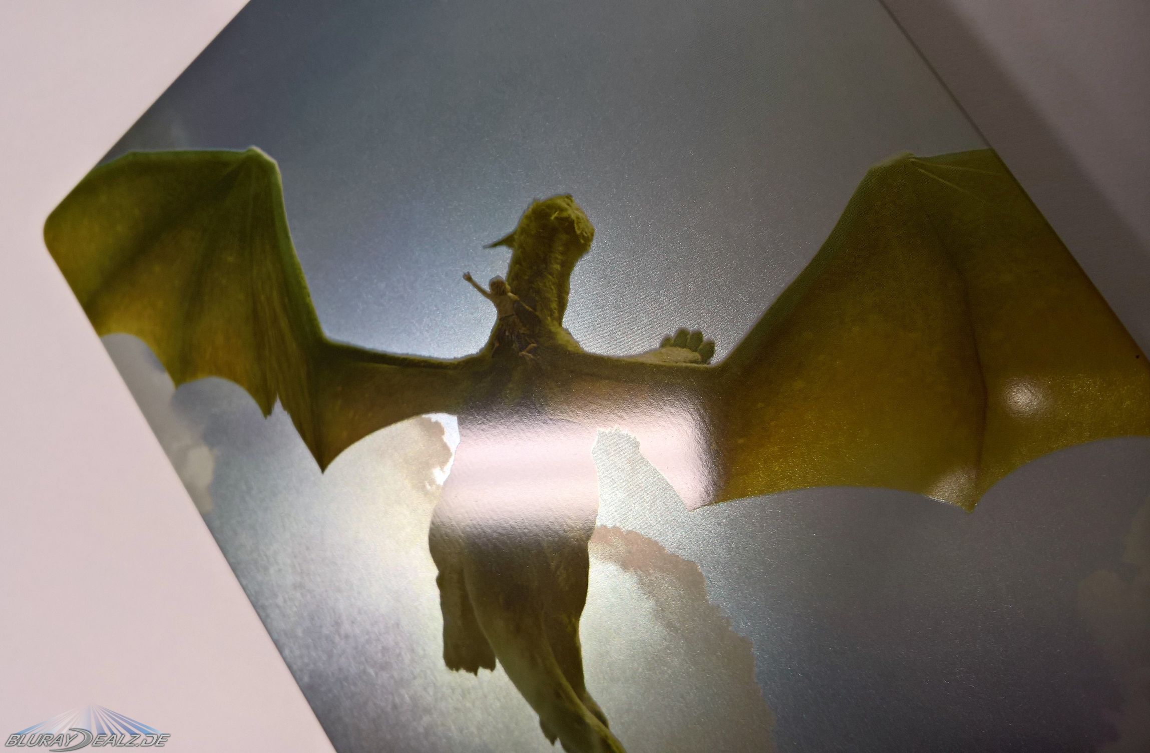 Innen haben wir eine Disc. KEIN 3D, gibt es wohl auch nicht im Heimkinosegment…war/ist der in 3D?……habe keine 3D VÖ gefunden. Naja. Egal. Der Innendruck ist zwar Saftig und stark aber Pete und sein Drache werden leider leicht unscharf an den Rändern.