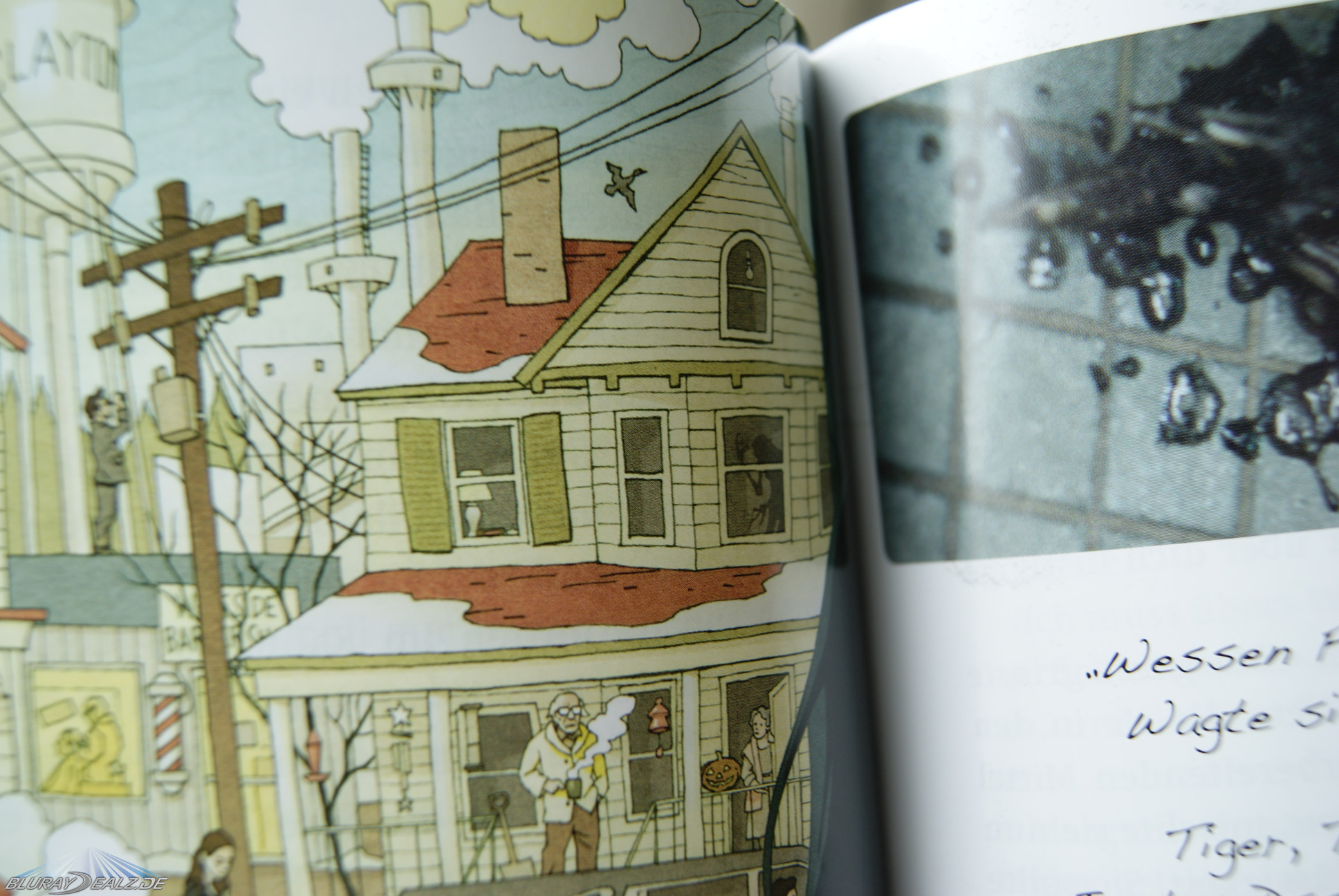 ) ist unter der Einschweißfolie von einer lose umgelegten J-Card umgeben. Diese trägt alle interessanten Infos (auf der Vorderseite genauer Inhalt und FSK-Flatschen – auf der Rückseite Spezifikationen und Inhaltsangabe des Films nebst Szenebildern). Das Mediabook hat eine wundervolle Oberfläche in Kunstlederoptik, die sich wunderbar anfühlt. Die Front zeigt den Titel nebst Untertitel im oberen Bereich und zeigt darunter das tolle und sehr stimmungsvolle Motiv. Dieses geht weiter über den Spine und wird auch auf der Rückseite weitergeführt. Auf der Rückseite ist dann großformatig der Name des Buchautors Dan Wells und der deutsche Titel des Buches genannt, auf dem der Film basiert. Die Außenseite des Mediabooks sucht schon seinesgleichen, aber innen geht es mindestens genau so gut weiter. Auf der linken Seite befindet sich die DVD, dahinter hier noch recht unspektakulär der deutsche Buchtitel auf einer reinweißen Seite. Rechts ist dann die Blu-ray mit schickem gezeichneten Clayton-Motiv (die Kleinstadt in der der Film spielt) in s/w. Dahinter sieht man das Disc-Motiv nochmal in groß. Der letzte Höhepunkt ist das 72 (!) seitige Booklet im Inneren. Da kann man schon fast eher von „Book“ reden. Es ist komplett auf dickem Hochglanzpapier gedruckt und enthält:
