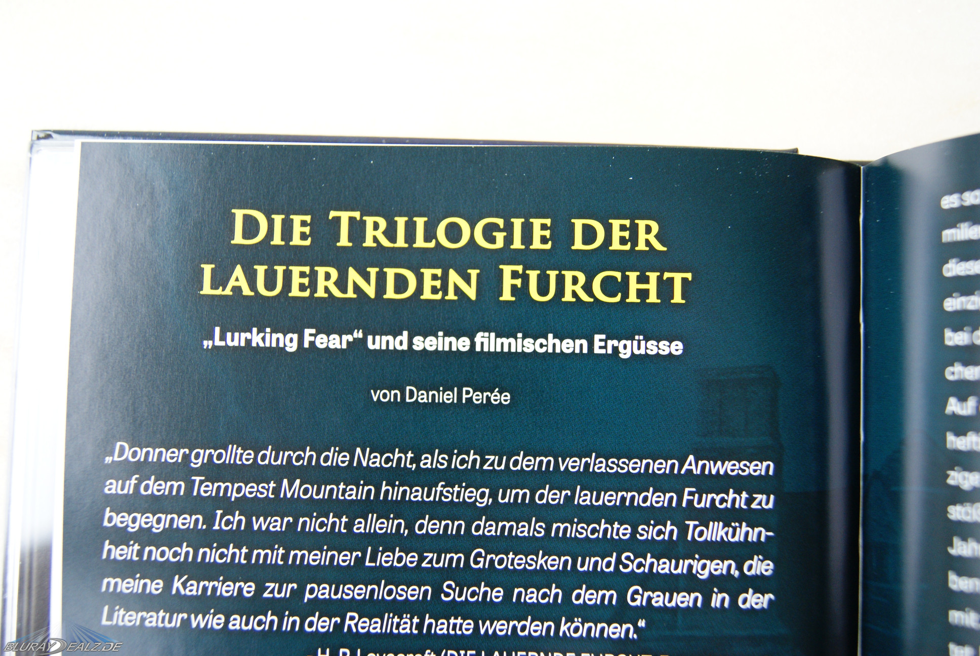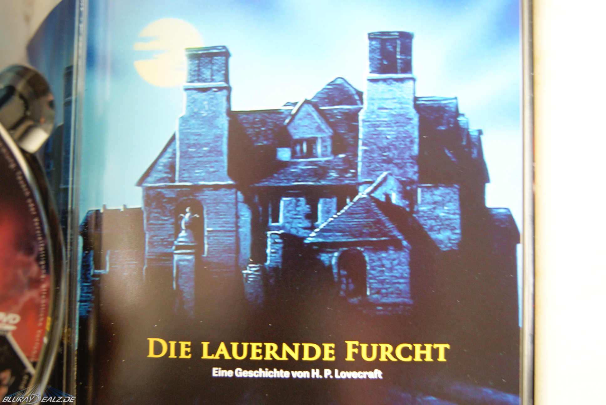 Die Rückseite bietet unter der Überschrift „Full Moon Collection No. 1“ ein gezeichnetes Bild von Ralf Krause, der auch das wundervolle Cover C entwarf, einige Szenenbilder, den Inhalt und die Specs. Im Inneren befindet sich links die DVD, rechts die Blu-ray. Beide Discs weisen tolle Motiven und Spiegeleffekte auf. Die Bilder hinter den Discs sind identisch – etwas langweilig, aber nicht minder schön. Das Booklet hat lediglich auf der Vorder- und Rückseite Motive. Hierbei handelt es sich um vergrößerte Bildausschnitte der Front des Mediabooks. Das 36seitige Booklet umfasst mit freundlicher Genehmigung des Festa-Verlags die Original-Kurzgeschichte „Die lauernde Furcht“ von Howard Philips Lovecraft über 25 Seiten. Keine der herausragenden Geschichten von Lovecraft, aber immer noch sehr gut. Es folgt ein Text über 6 Seiten („Die Trilogie der lauernden Furcht“) von Daniel Perée über die bisher erschienen Filme, die sich an „The Lurking Fear“ von Lovecraft orientierten. Danach noch Credits zum Mediabook und eine Auswahl des Festa-Verlagsprogramm (ein kleiner, aber feiner Verlag – sehr zu empfehlen). Das Mediabook hält locker den Capelight-Standard.