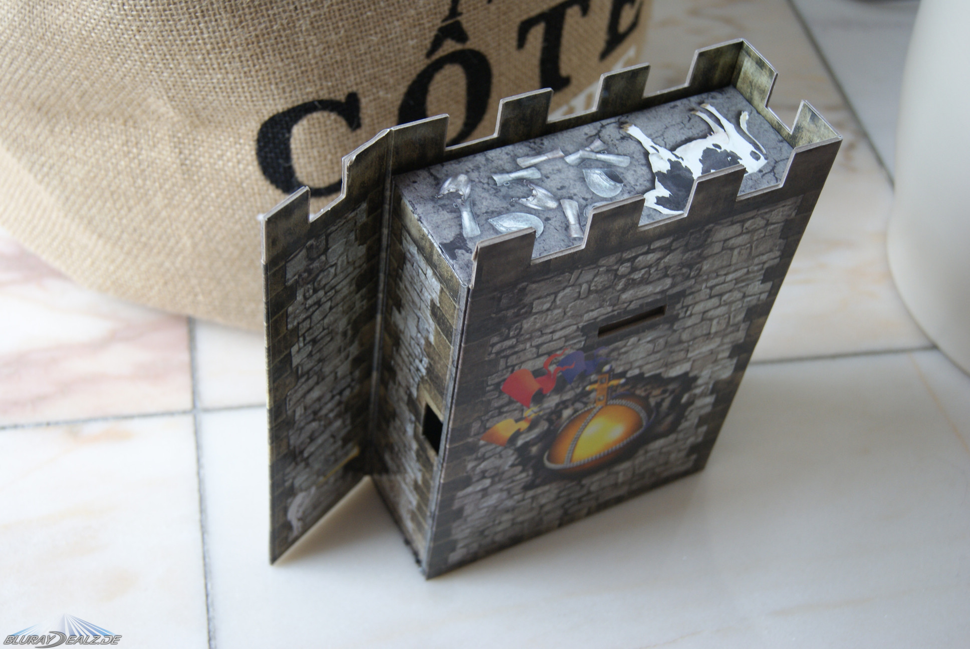 Der FSK-Flatschen lässt sich problemlos von der Plastik-Ummantelung entfernen. Unter dieser – die auf der Rückseite alle wesentlichen Informationen enthält – befindet sich die Burg aus stabiler Pappe. Diese Burg enthält oben in einer separaten Packung die abschießbaren Gummitiere. Die Burg ist auf der Seite zu öffnen – mittels Magnetverschluß. Dort drin befindet sich der Film im Keep Case in einem Schuber, indem auch das an der zu befestigende Plastikkatapult aufbewahrt wird. Der Spaß, die Tiere mit dem Katapult abzufeuern, mag ja albern sein, ist aber schwer zu überbieten