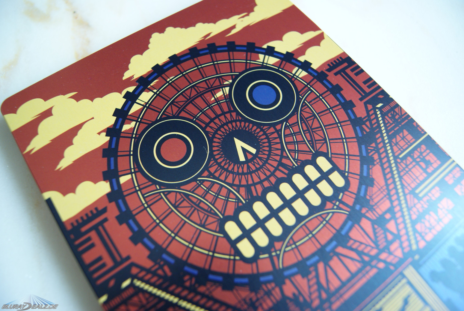 Dieses Steelbook gefällt mir von den neuen am besten. Eine schöne bunte Front mit viel Glanz und sehr passend zum Rummelplatz im Film. Einfach cool. Die Rückseite wirkt wie eine Detailaufnahme der Front – sehr passend. Innen die bekannte Disc aus der KeepCase-Edition auf (ein)farbigem Innendruck.
