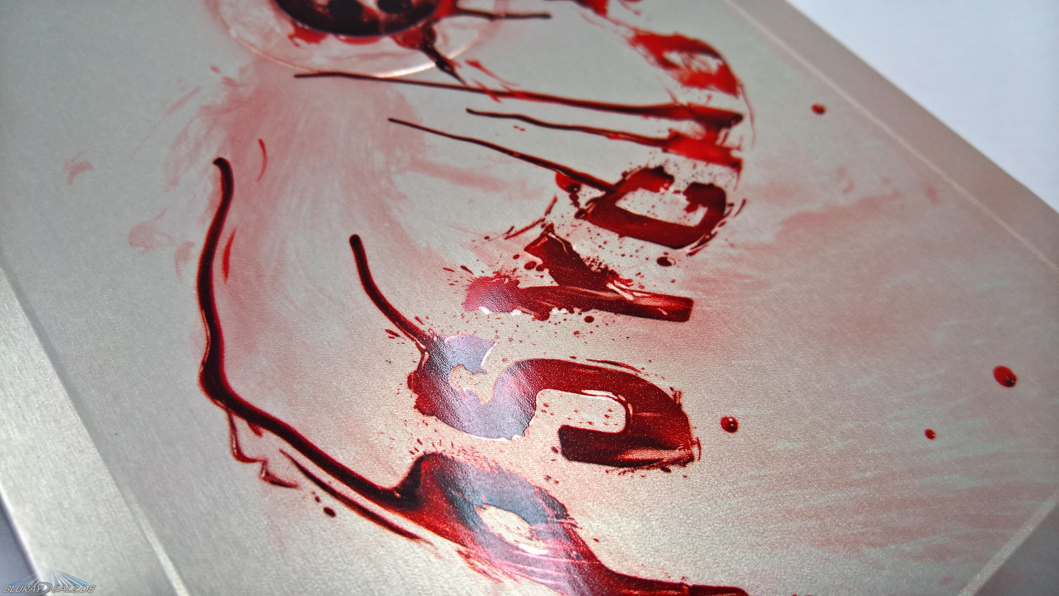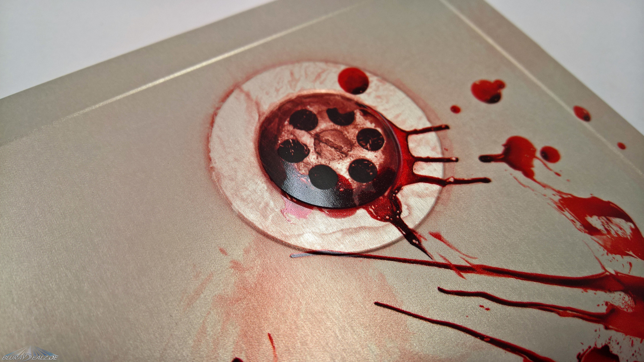 Die Front des Steelbooks kommt blutigverschmiert daher. Das Blut welches in den geprägten Abfluss läuft, ist in Spotgloss gehalten. Auch die Blutstropfen und die verlaufende Psychoschrift ist in schickem klebrigspotgloss. Sehr sehr schicker Effekt. Dann ist der Rest des Steelbooks in blutig verdreckt designed.