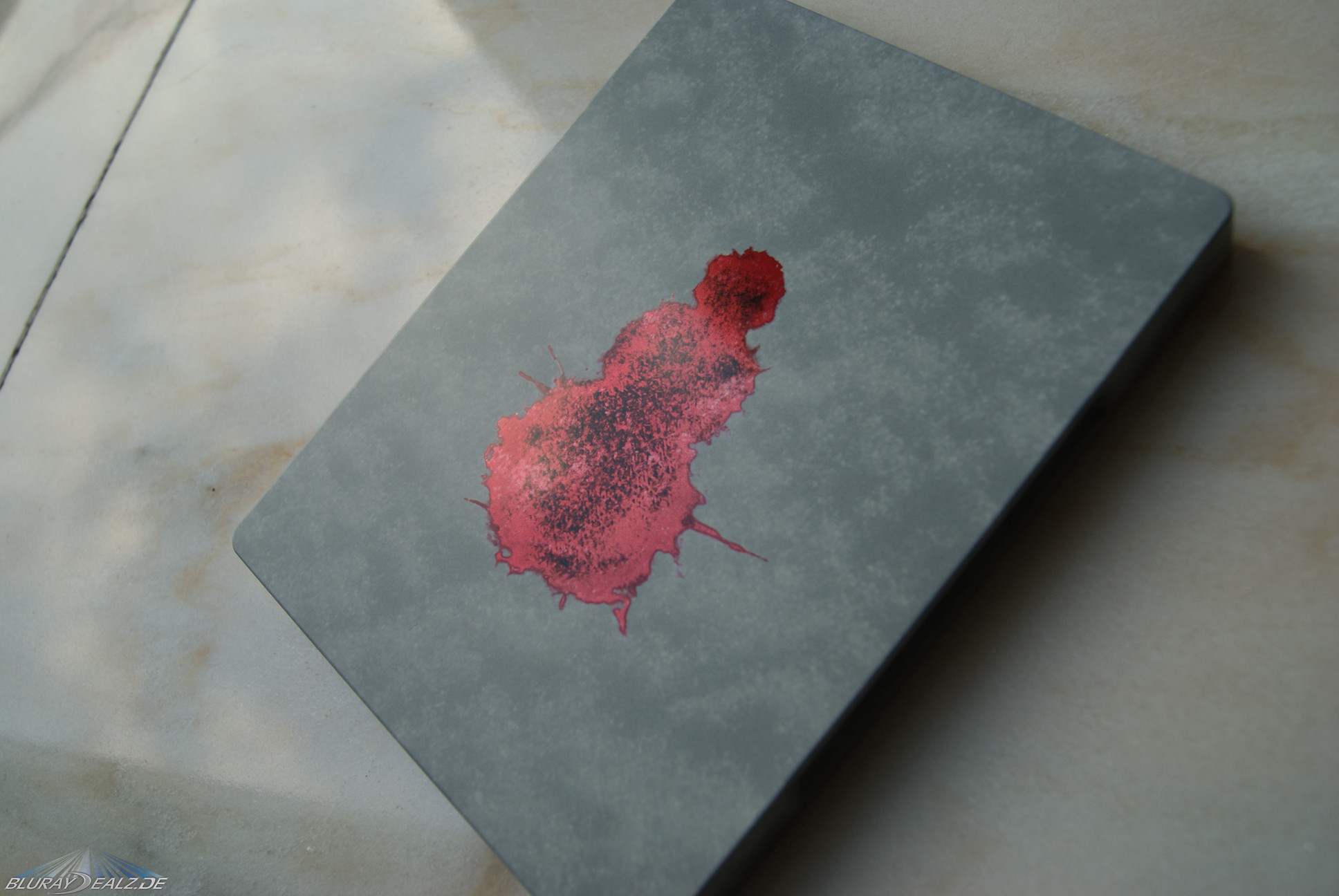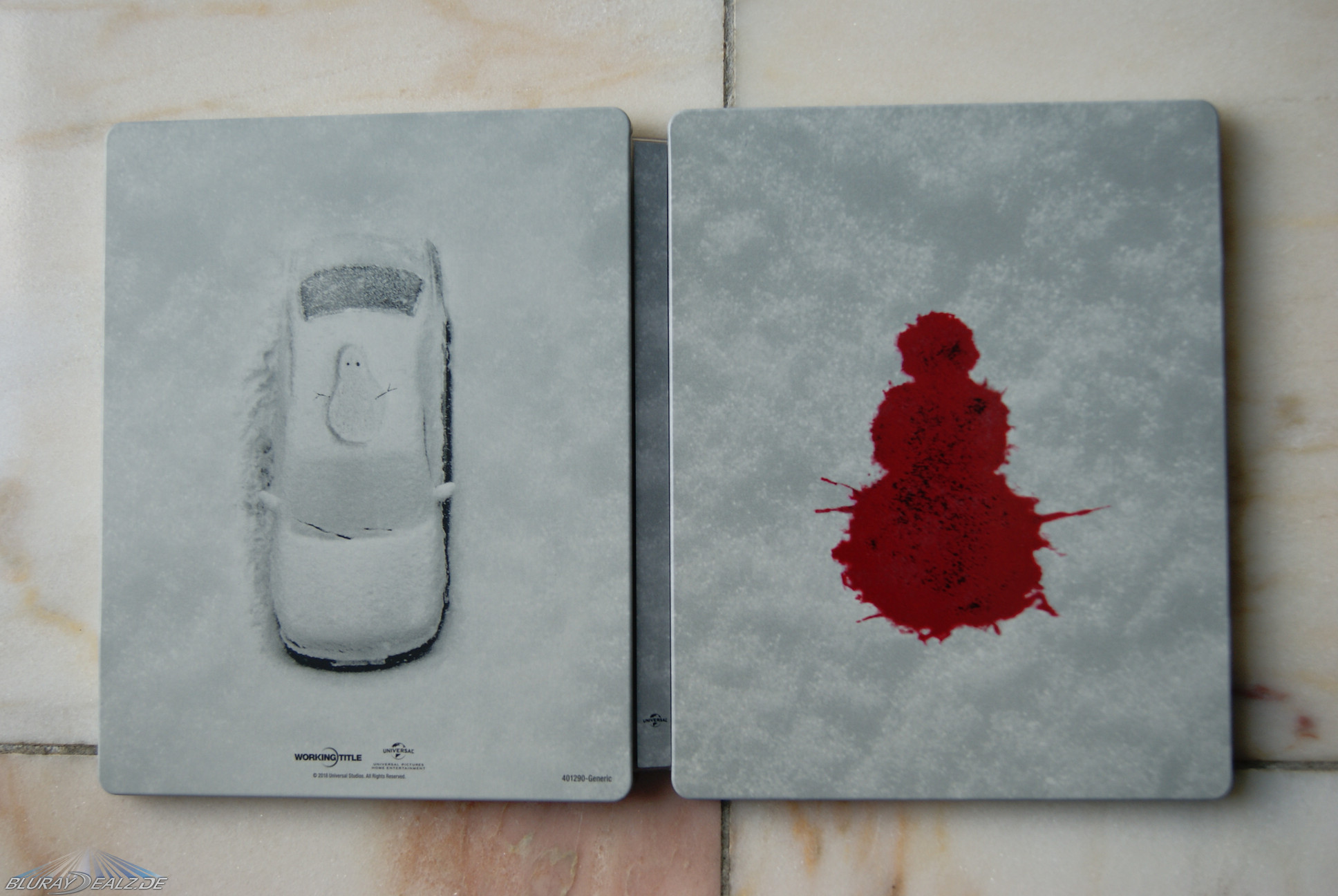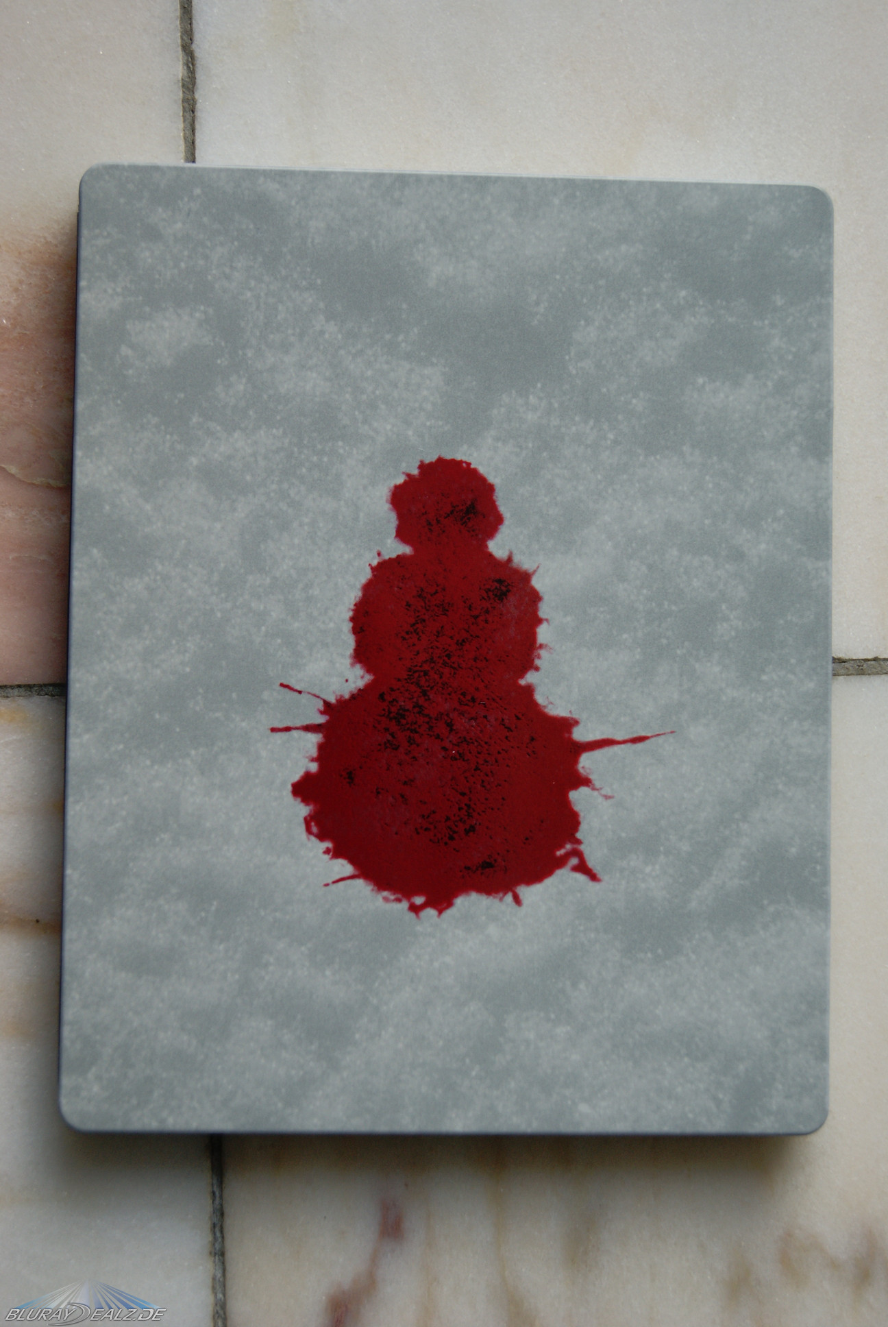 Es handelt sich beim Steelbook selbst um ein mattes Steelbook im „Schnee“-Design. Der komplette Hintergrund ist in einem weiß-grauen Schneeuntergrund gehalten, dazu gehört auch der leider titellose Spine. Der Schneemann im Blutstropfen-Design vorne ist in Spotgloss gehalten, was einen netten Kontrast zum matten Hintergrund bewirkt.