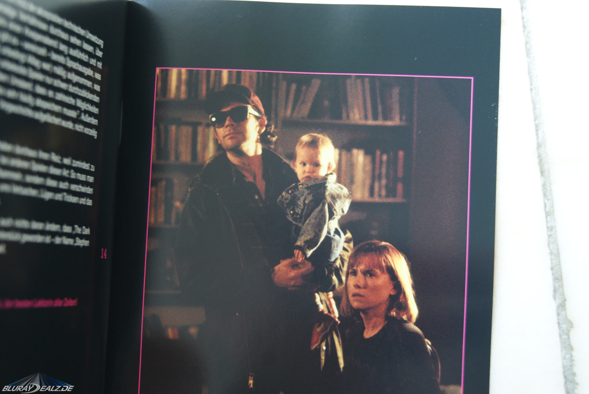 Wenn man das Digipack ein zweites Mal auseinanderklappt, sieht man die einheitlich gehaltenen drei Discs (Film auf Blu-ray, Film auf DVD, Bonus-DVD mit über 5 Stunden Extras). Ganz links befindet sich in einem Einsteckfach ein im Lovecraft-Design (Tentakei !) gehaltenes Limitierungs-Zertifikat und das 16seitige Booklet. Dieses kommt ohne viele Bilder aus (lediglich eines, dazu das gezeichnete Motiv auf der Titelseite), dafür mit einem tollen Text von Thorsten Hanisch. Hier geht Hanisch auf Kings ganz persönliche Verbindung zum Buch “The Dark Half” ein, ebenso zu Romero und seine Umsetzung des schweren Buchstoffes zum Film. Dazu noch eine interessante Auflistung mit Unterschieden zwischen Film und Buch, am Schluß wird noch auf das PC-Spiel zum Film eingegangen. Hierbei handelte es sich um ein “Point-and-Click”-Adventure – ähnlich den berühmten “Maniac Mansion” und “Monkey Island” – das an seiner Vorgabe litt, sich zu sehr an den Film zu halten. Inzwischen soll das Game jedoch echten Sammlerwert haben. Kennt jemand das Spiel ?