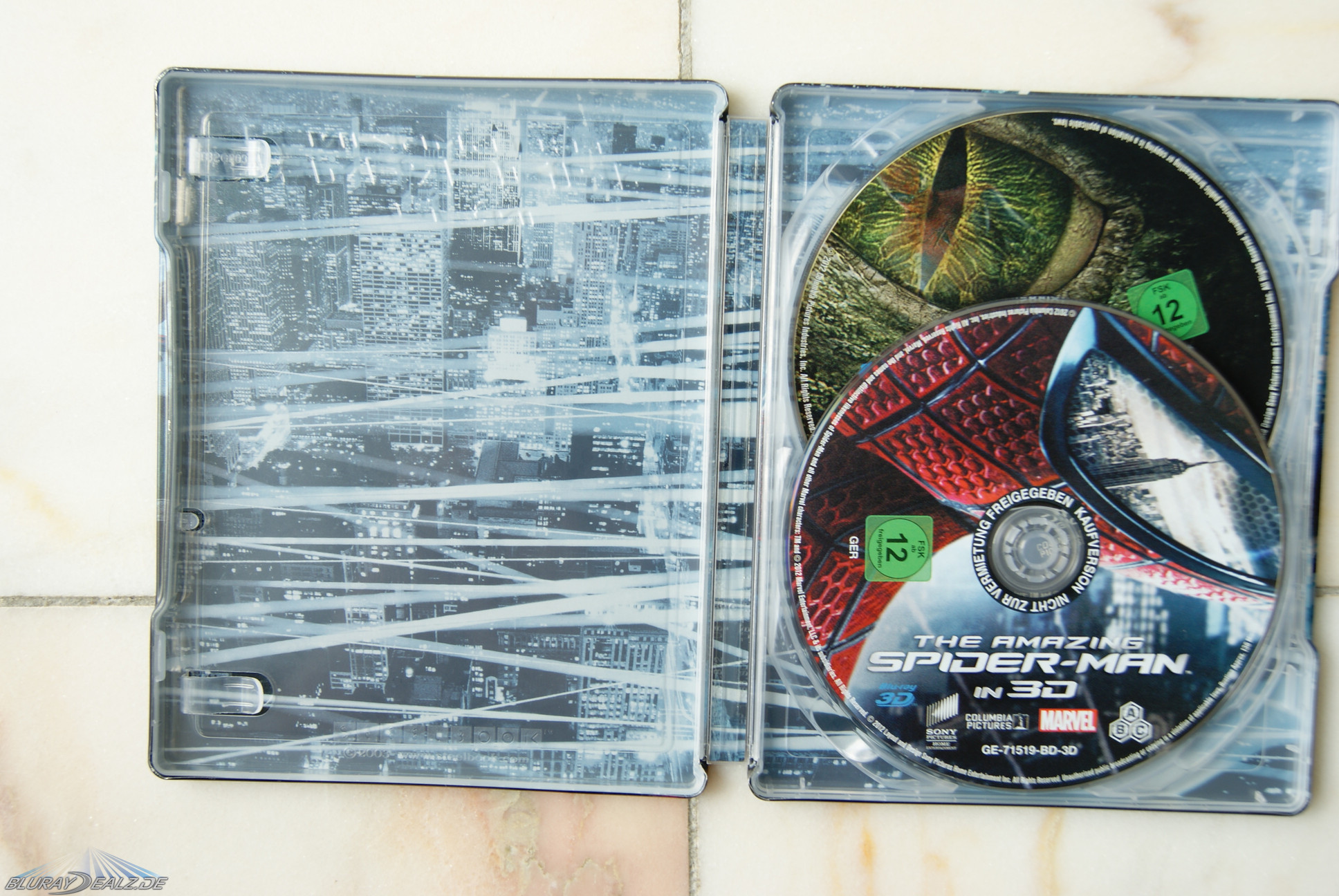 Das Steelbook ist im Gegensatz zum bekannten Steelbook geprägt (Titel- und Rahmenprägung) und trägt auf der Vorderseite leider den Schriftzug „in 3D“ (ebenfals geprägt). Das Motiv ist das des normalen Steelbooks (ebenso wie der Innendruck), lediglich die Rückseite zeigt ein neues Bild und zwar klettert uns hier Spidey entgegen. Die Farben sind kräftig, lediglich die Glanzeffekte sind hier nicht ganz so intensiv.