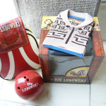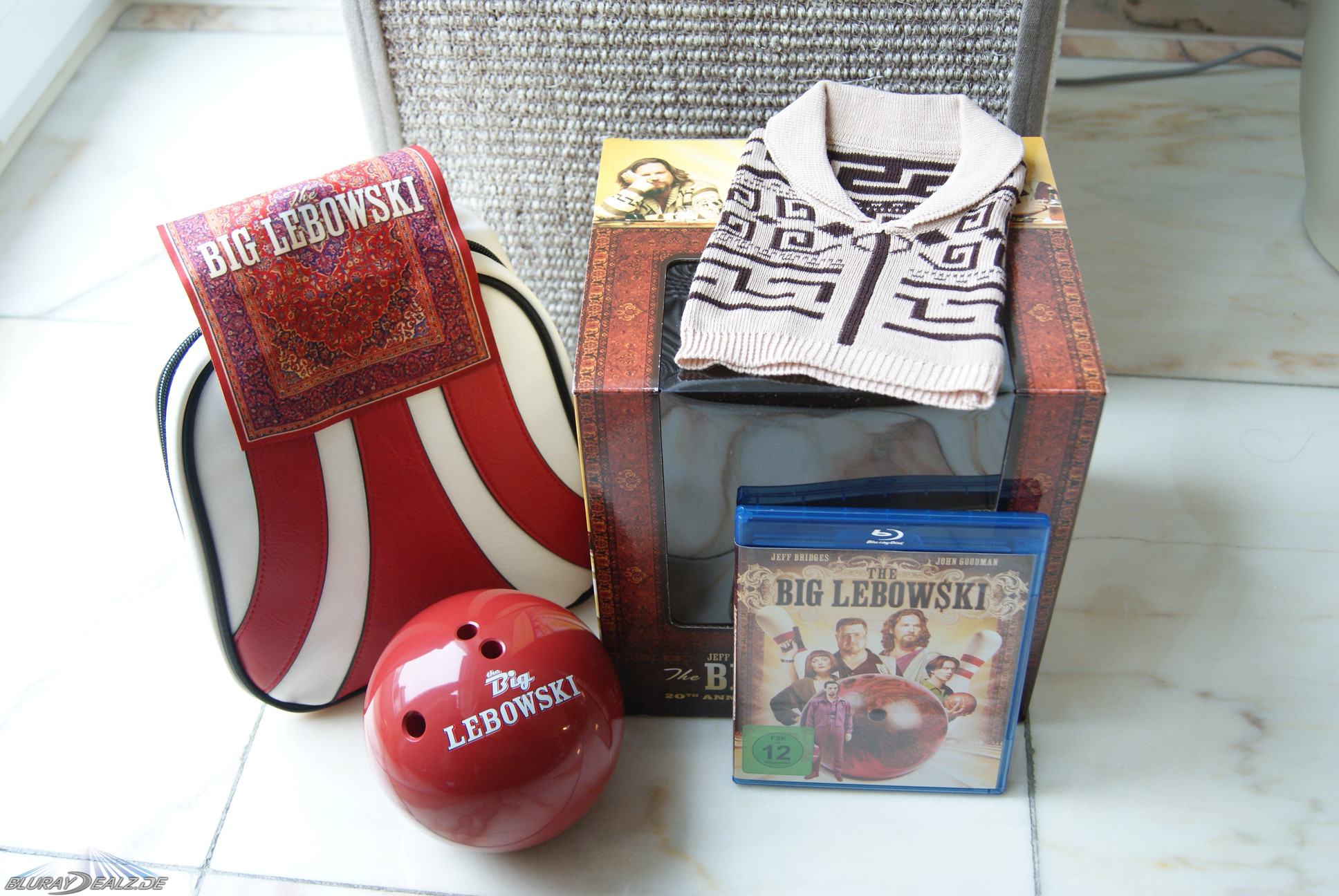 Die Tasche im Inneren selber lässt sich über einen gut funktionierenden Reißverschluss öffnen und offenbart die weiteren Goodies. Als da wären: eine Miniatur-Bowlingkugel, leider nur aus Kunststoff und damit definitiv zu leicht, die man prima für seinen Bürotisch als Stiftehalter nutzen kann. Ebenso eine ein Poliertuch im Teppichdesign und zudem ein weiterer Höhepunkt: die Disc, leider nur in der Amaray, in einem der wunderbarsten Slipcases, die ich bis dato habe: der Pullover des Dude. Die Amaray selber verfügt über ein Wendecover, der Pullover bedarf keiner weiteren Beschreibung