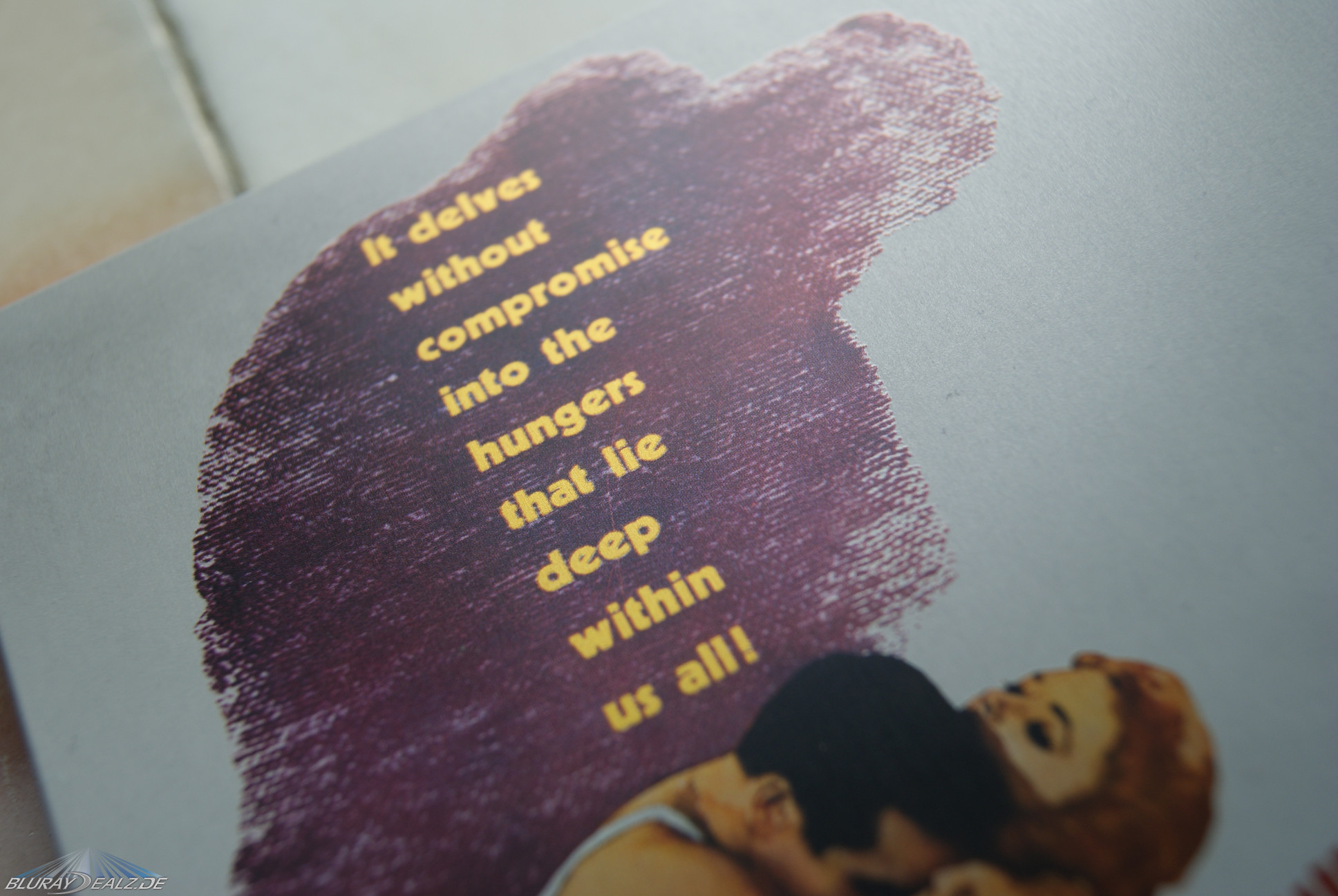 Das “The Hustler” Steelbook ist von einer aus etwas dünneren Pappe bestehenden unten offenen ¼ Slip J-Card umgeben. Es hat als Grundfarbe auf beiden Seiten ein mattes Weiß. Auf der Vorderseite sehen wir ein gezeichnetes Motiv, dass Paul Newman in inniger Umarmung mit Piper Laurie zeigt. Die beiden werfen einen großen dunklen Schatten über die Vorderseite. Der darin stehende Text und die Haut der abgebildeten Personen glänzen golden. Rechts stehen noch der Titel sowie die Namen des Regisseurs und der Hauptdarsteller in typischer 60er Jahre Aufmachung. Die Rückseite zeigt nur ein Motiv in der unteren Hälfte des Covers und zwar Paul Newman am Billardtisch. Das Motiv verfügt beim Schwenken über einen schicken Negativeffekt.