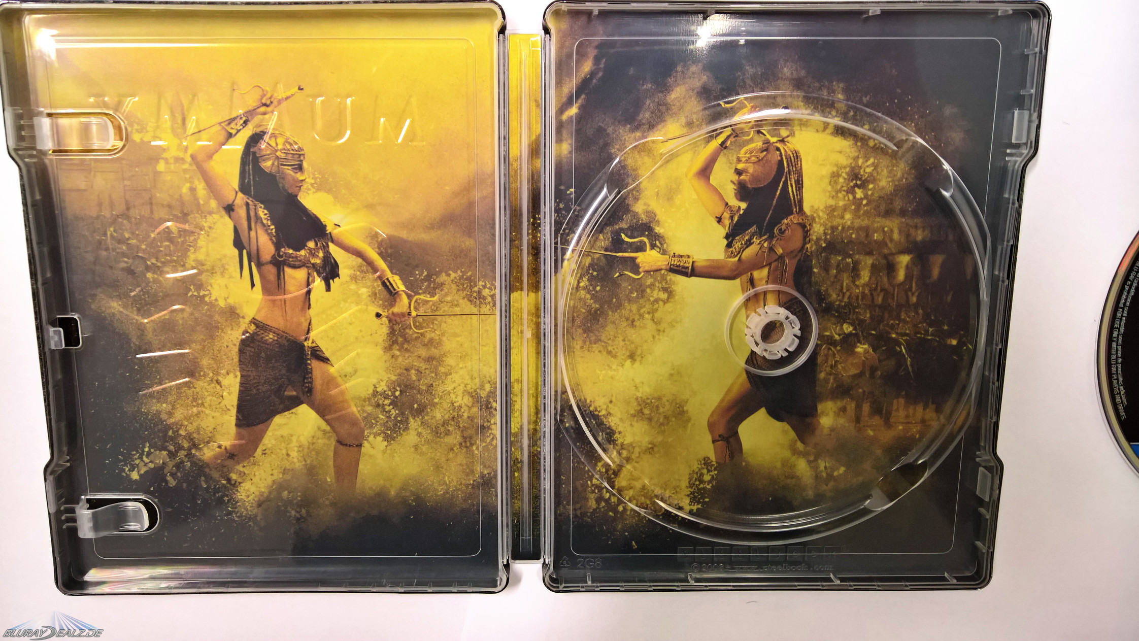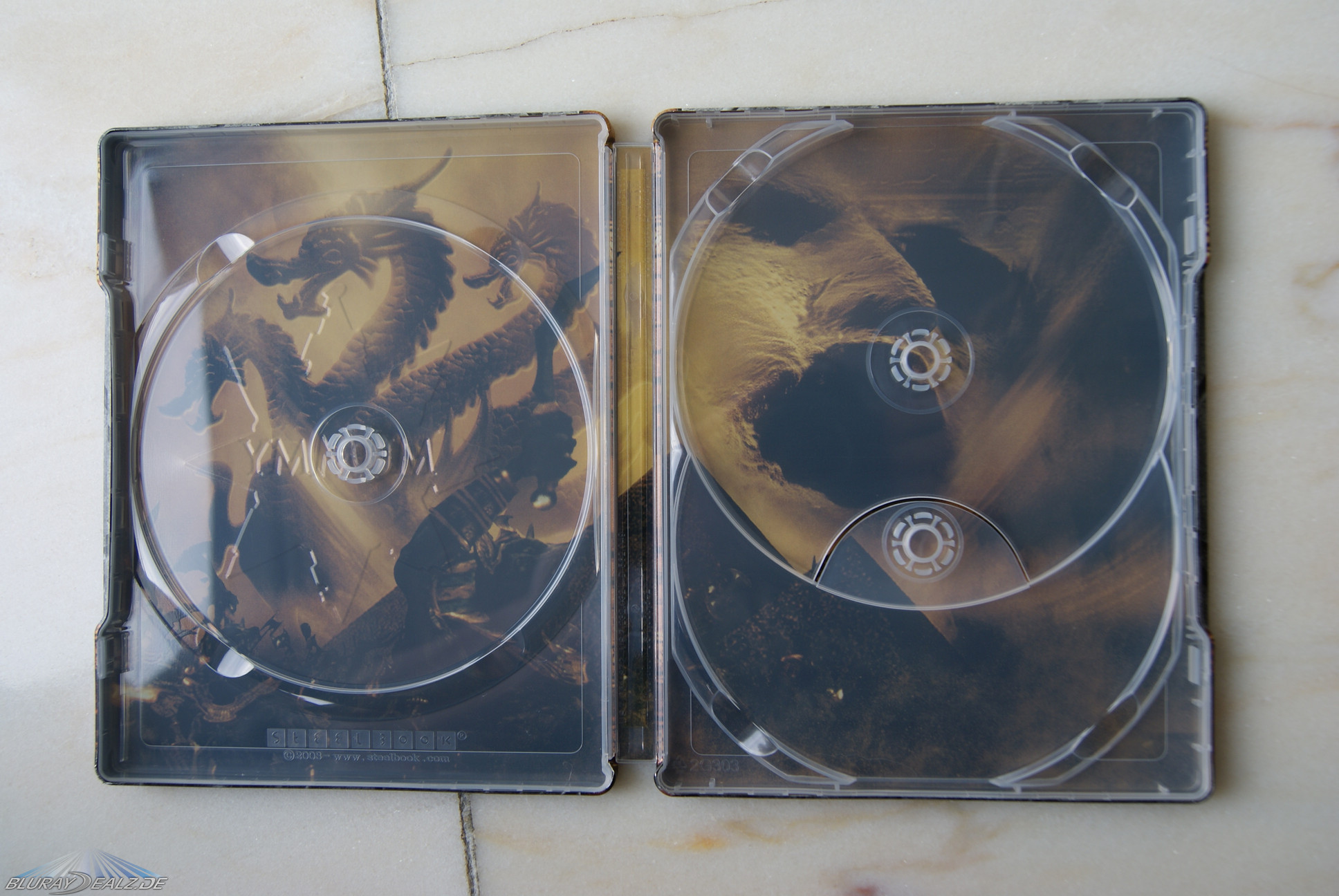 Alle Steelbooks haben das gleiche Design, vorne drauf ist der Titel geprägt und zu jedem Film ein passendes Emblem ebenso geprägt und in schickem Goldton gehalten. Bei Teil eins ein Skarabäus, das zweite Steel hat einen Skorpion und beim dritten Film wurde ein Drache als Frontmotiv gewählt. Alle drei Designs passen zu den Filmen und auch super zueinander.