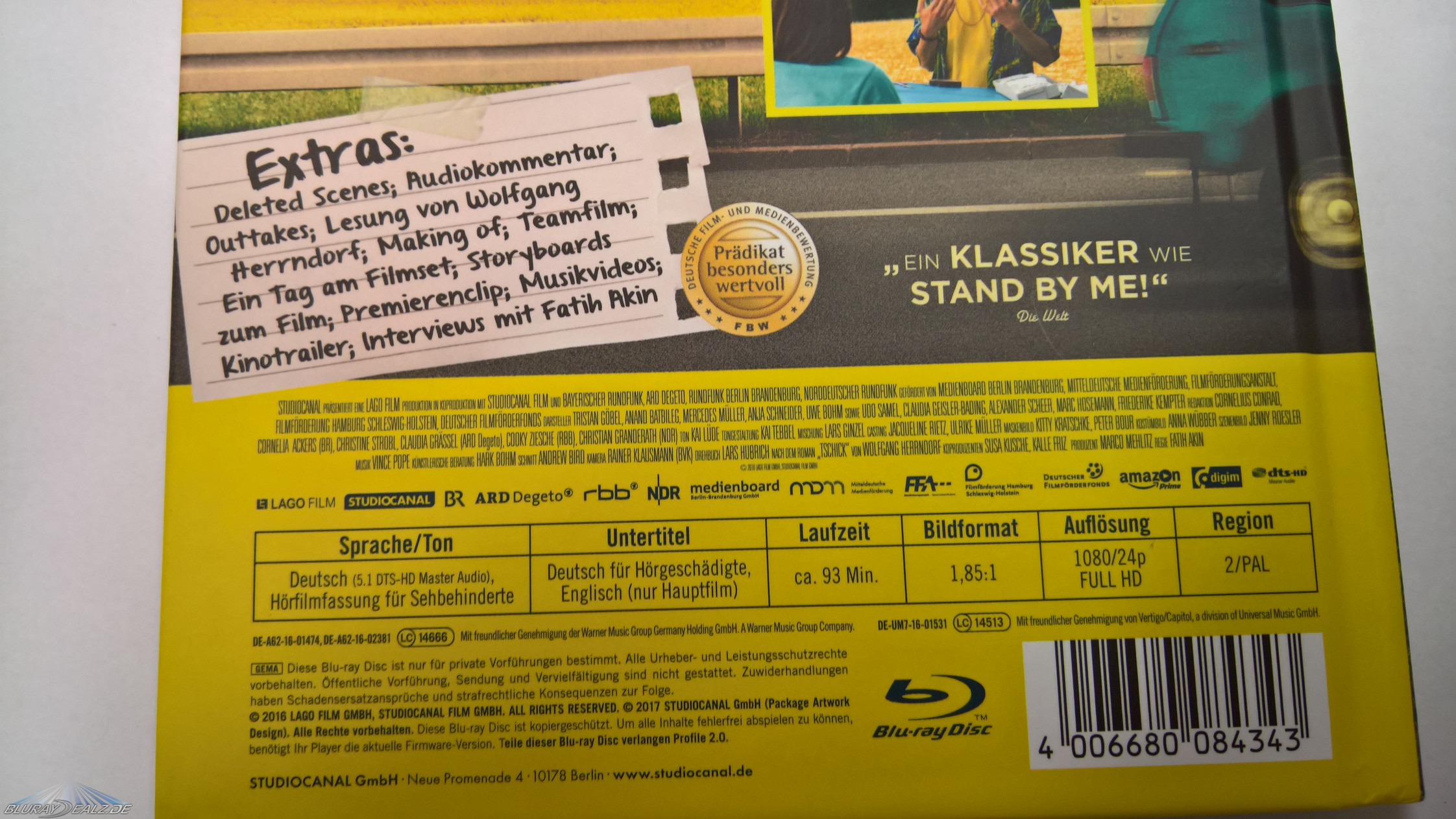 Mediabook ist wirklich (t)schick geworden. Es hat eine Buch/Papieroberfläche die sich edel anfühlt. Vorne drauf wird gut mit dem Bild gearbeitet und die Texte passen sich ins Artwork ein. Der Spine führt die Front weiter und sagt uns nochmal, dass es tschick ist. Hinten zwar gut gestylt, aber eventuell doch etwas zu viel Werbung bzw. Text. Aber nuja, es ist ja ein Mediabook.