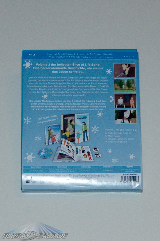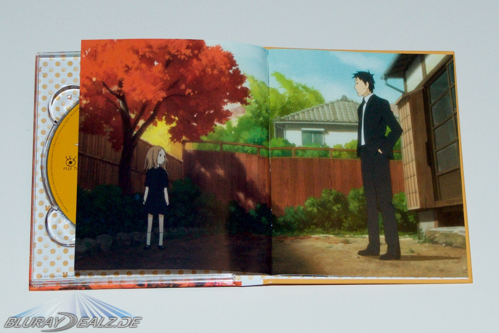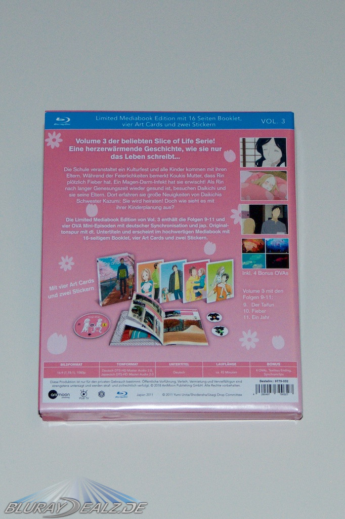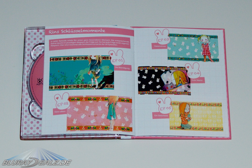 Insgesamt gibt es bei dieser Anime-Serie drei Teile, welche alle in einem Limited Mediabook als DVD oder Blu-Ray Version daher kommen mit identischer Ausstattung und Optik und etwa je 37€ kosten (3 für 2 Aktion lässt grüßen). Beim ersten Teil der Serie ist zusätzlich ein Pappschuber dabei und ein kleiner Stoffhase, welchen Rin im Verlauf der Serie als Kuscheltier hat. Beim zweiten Teil befindet sich im Mediabook ein gefaltetes, doppelseitiges Maxiposter sowie zwei kleine Sticker mit dem Hasen. Im dritten und letzten Serienteil gibt es 4 Art-Cards (Postkartenformat) sowie zwei weitere Aufkleber mit dem Hasen. Jedes Mediabook beinhaltet eine Silberscheibe auf transparenter Halterung und zusätzlich gibt es noch ein kleines Heftchen mit weiteren Informationen, Bildern oder einer Kapitelübersicht. Die Seiten sind dabei recht liebevoll gestaltet.