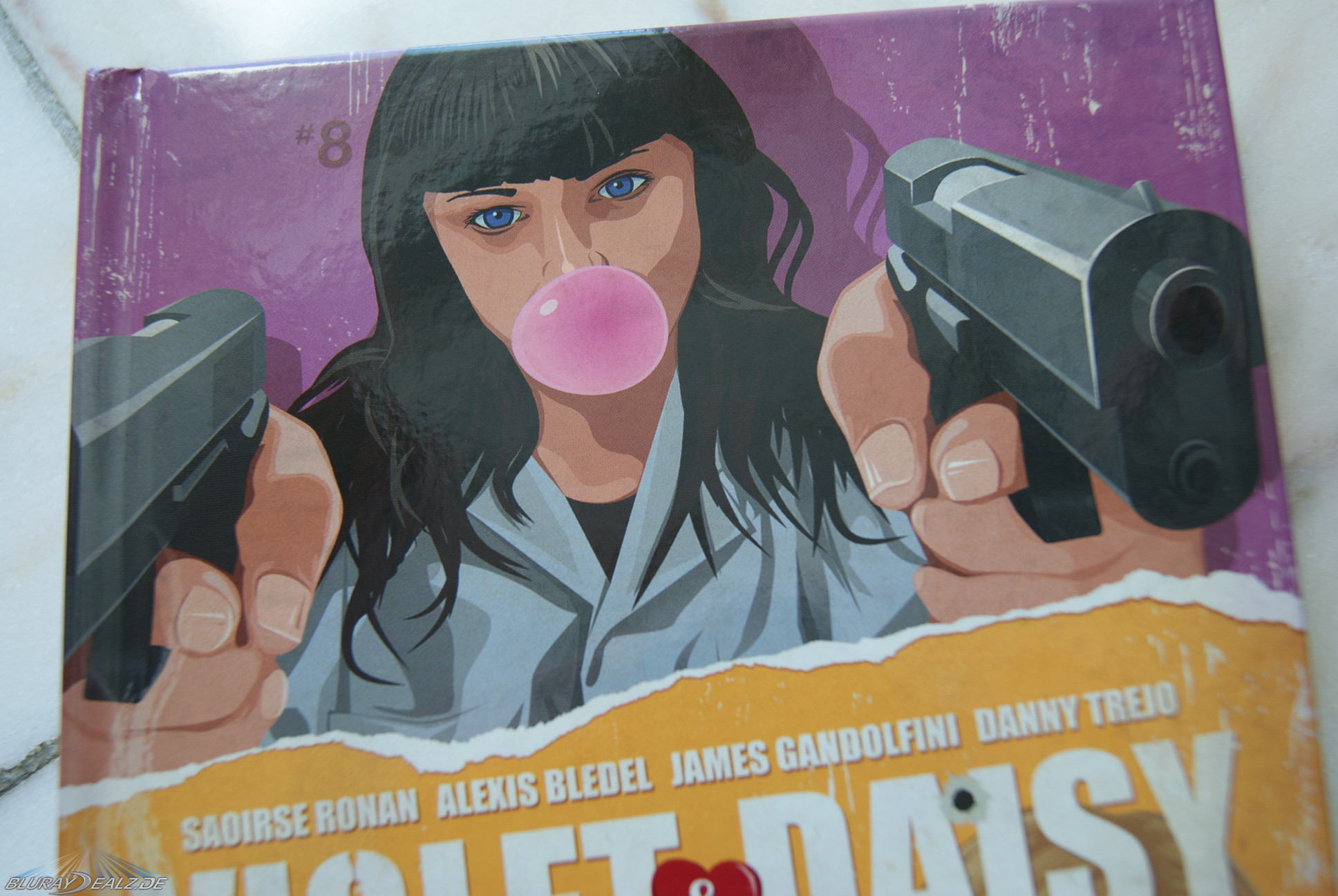 Auf der Mediabook-Frontseite liegt Capelight-typisch eine Karte auf, die einige Informationen und den FSK-Flatschen enthält. Darunter befindet sich das gleiche Cover ohne diesen störenden Text. Die Farben des glänzenden Mediabooks richten sich nach dem Filmtitel Violet (Veilchen) & Daisy (Gänseblümchen) und sind lila und gelb. Das finde ich schön umgesetzt und man merkt, da hat jemand nachgedacht. Das Titelbild ist gezeichnet und wirkt ungeheuer plastisch (besonders die Revolver oder die Kaugummiblase). Auch die Rückseite ist wieder in lila und gelb gehalten, zeigt einige Bilder und die üblichen Spezifikationen – klar, ein reines Backprint wäre natürlich netter gewesen.