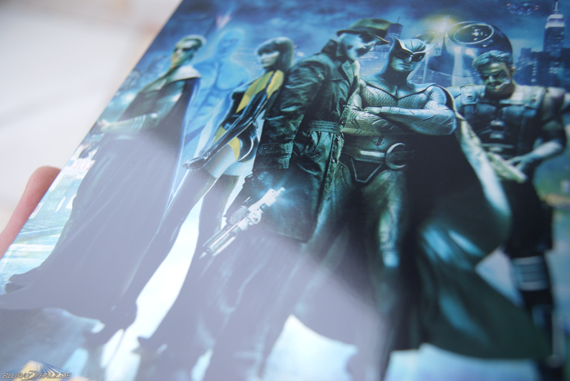 Trotz der tollen Front und Back kommt das wahre Highlight aber innen. Ein atemberaubender Innendruck, da muss man sich vor den Disney-Innenartworks definitiv nicht verstecken. Vor einem leicht glänzenden Hintergrund sehen wir hier großformatig noch mal alle Watchmen – tolles Bild.