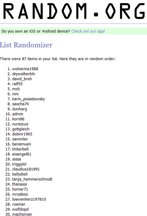 Die Entscheidung ist gefallen. Random.org hat entschieden.