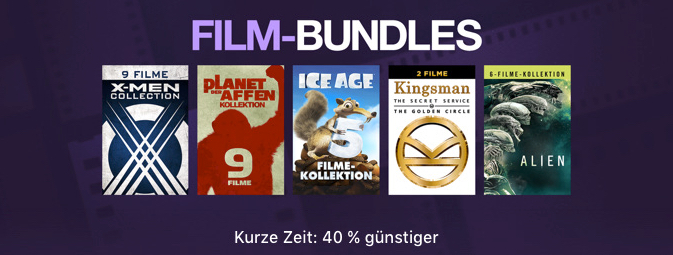 Wer auf 4K (teilweise) umstellen will, einfach seine DVD Sammlung auf HD Upgraden will oder bisher noch keinen der nachfolgenden Filmbundles besitzt, dürfte gerade recht preiswert davon kommen mit dem aktuellen Angebot der iTunes Filmwelt. 29 ausgewählte Titel sind für begrenzte Zeit 40% günstiger. Achtung! Die Preise gelten nur für die Bundles. Die Einzelpreise der Filme sind nicht reduziert! Bereits gekaufte Filme aus iTunes werden leider nicht an die Bundlepreise angerechnet (Dank an die Filmlobby)