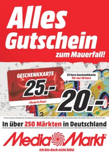 „25 Jahre Mauerfall“ bedeutet bei Media Markt, dass man ab morgen (08.11.2014) bis einschließlich Dienstag (11.11.2014) bundesweit 25 € Geschenkkarten für 20 € kaufen kann… man erhält somit rechnerisch 20% Rabatt auf alles.