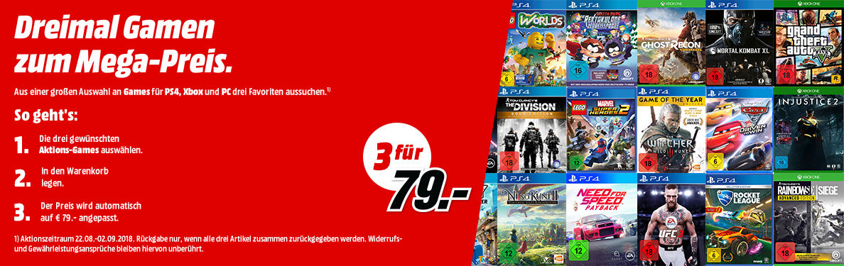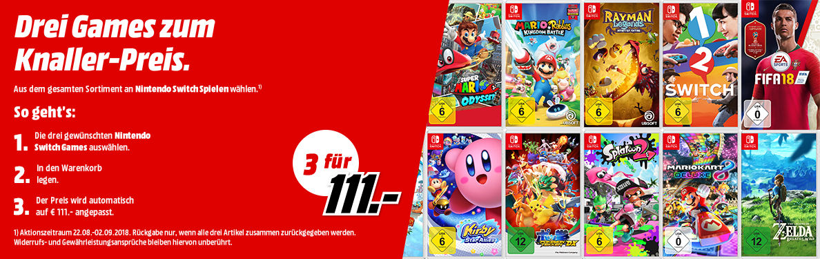 MediaMarkt.de: 3 Spiele für 49€ & 3 Spiele für 79€ & 3 Nintendo Switch Spiele für 111€ (ab 22.08.18).