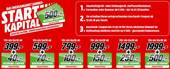 Bei Kauf der folgenden Produkte: Haushaltsgroßgeräte, Einbaugeräte, Fernseher, Kaffeevollautomaten, Beamer, und für etwaig weitere mit einem Coupon gekennzeichnete Produkte zwischen dem 03.01.2018 und dem 14.01.2018 gibt es einen Geschenk-Coupon in Höhe von bis 500€ dazu. Coupon nur einmalig bis einschließlich 31.03.2019 ab einen Mindesteinkaufswert in Höhe des Couponwerts + 0,01€ einlösbar. Keine Barauszahlung.Bei Markt-Käufen wird die Coupon-Card direkt im Markt ausgegeben, bei Online-Käufen/-Bestellungen wird der Coupon-Code ab dem 13.02.2018 per E-Mail versendet. Coupon-Cards einlösbar in Media Märkten in Deutschland, Coupon-Codes einlösbar unter mediamarkt.de. Warenrücknahme nur bei gleichzeitiger Rückgabe/Erstattung des Geschenk-Coupons, Gewährleistungsansprüche bleiben hiervon unberührt.