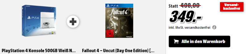 MediaMarkt.de verkauft die PS4 (weiß oder schwarz) [neue Revision mit 500GB] inkl. Fallout 4 Day One Edition für 349€ inkl. VSK.
