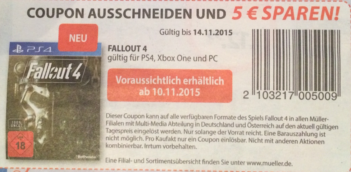 Des Weiteren ist auch ein 5€ Gutschein für Fallout 4 enthalten. Dieser gilt für die PS4, XBox One und PC Version. Gültig bis 14.11.15