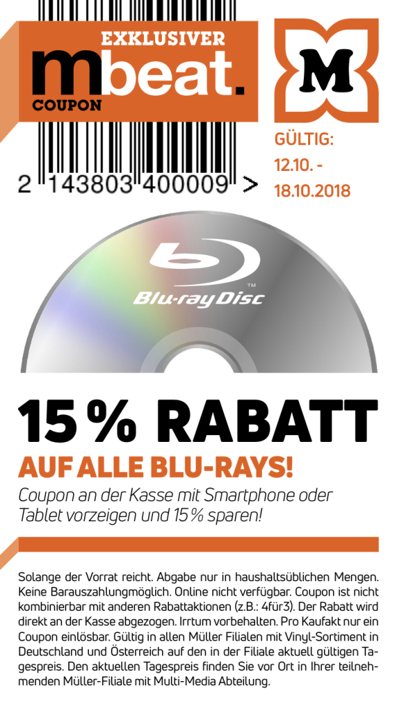 Bei Mueller.de gibt es vom 12.10. – 18.10.18 einen Rabatt von 15% auf alle Blu-rays.