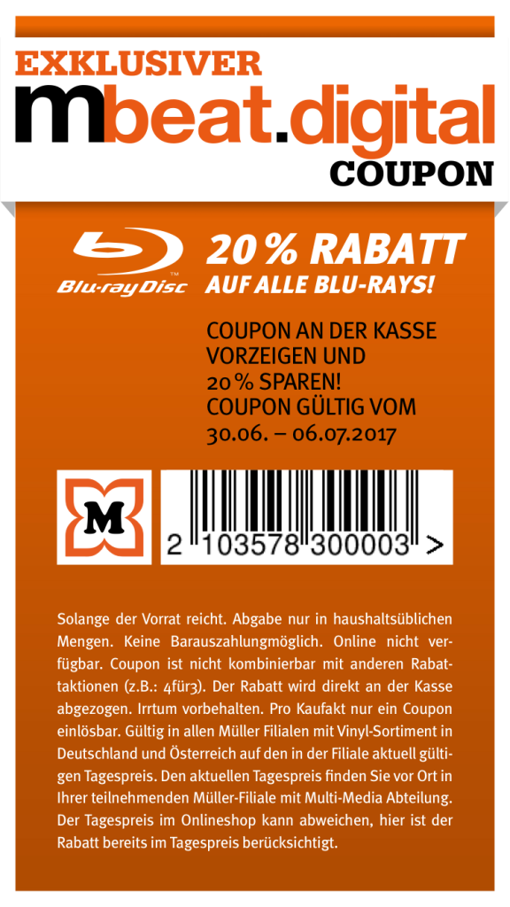 Bei Mueller.de wird es vom 30.06.-06.07.17 20% Rabatt auf alle Blu-rays geben. Ausgeschlossen sind Aktionen wie 4 für 3.