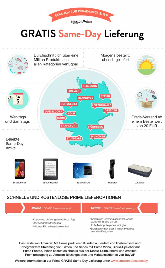 „Für Adressen in bestimmten Postleitzahlbereichen bieten wir Amazon Prime-Mitgliedern einen gratis Versand per Same-Day (Evening-Express) für qualifizierte Same-Day Artikel ab einem Bestellwert von 20 EUR an. Bestellen Sie innerhalb eines bestimmten Zeitfensters, dann erhalten Sie eine große Anzahl unserer Artikel garantiert noch am selben Tag zwischen 18 Uhr und 21 Uhr. (auch Samstags)“