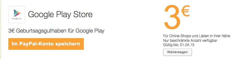 Bei Paypal gibt es wieder 3€ Guthaben für den Google Play Store. Einfach über den Link das Paypalkonto mit dem Google Play Store Konto koppeln und 3€ Guthaben bekommen.