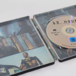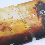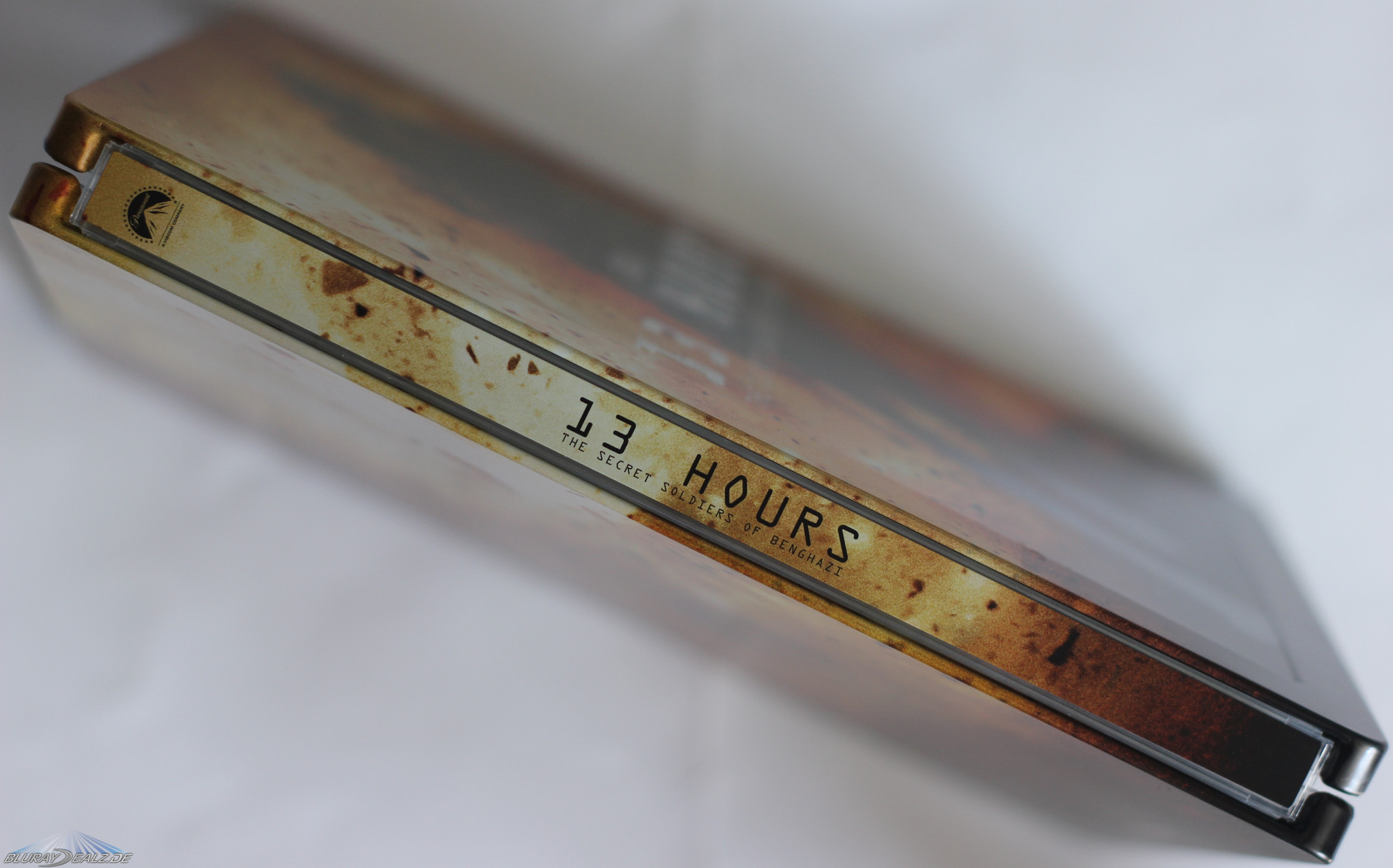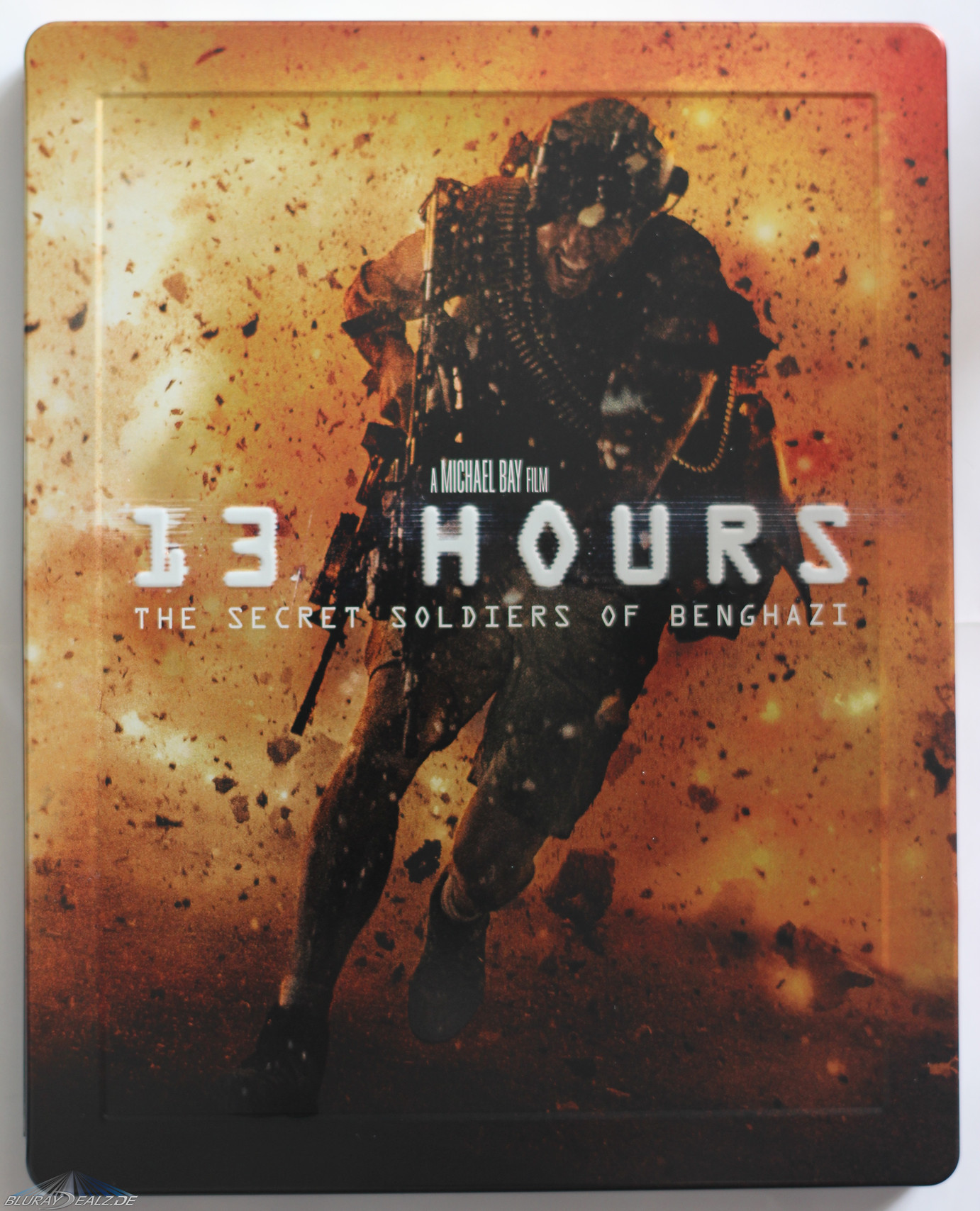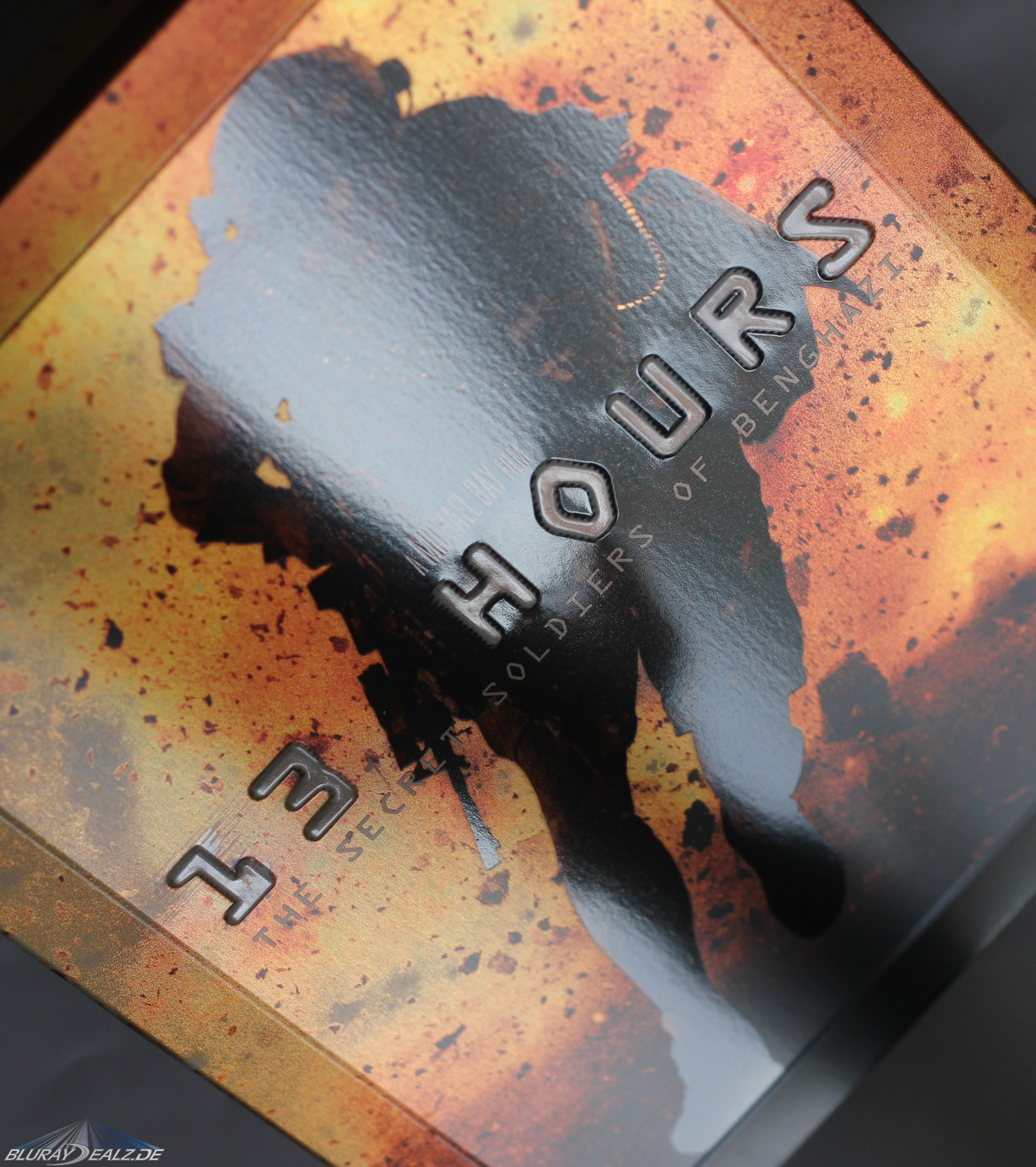 Das textfreie Steelbook präsentiert ein mattes Oberflächen-Finish mit einem das gesamte Artwork (auch Backcover) einnehmenden Schimmereffekt, welcher live echt gut aussieht. Doch das ist nicht die einzige Besonderheit: der sich vor einer Explosion schützende Soldat auf der Front ist zudem im Spot-Gloss gehalten (partieller Hochglanz) und der Titel „13 Hours“ ist geprägt (embossed). Zusätzlich liegt eine Rahmenprägung vor.