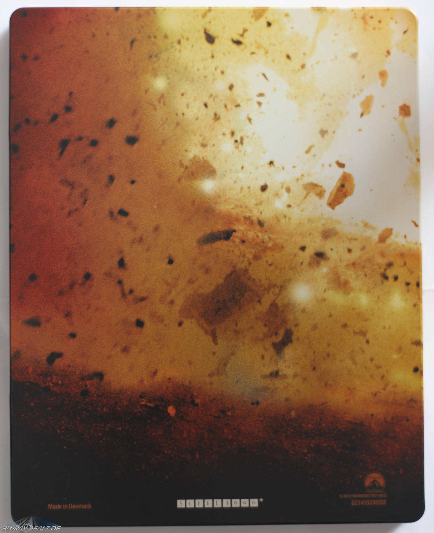 Das Rückseitenmotiv ist dabei eine direkte Fortsetzung des Frontartworks und zeigt weitere Explosionssplitter sowie die (hellere) Detonationsquelle mit dem zuvor schon erwähnten Schimmereffekt. Mir gefällt das bei diesem Film sehr gut – nicht zuletzt ist „Explosion“ ja auch das beschreibende Wort für Bay-Filme.